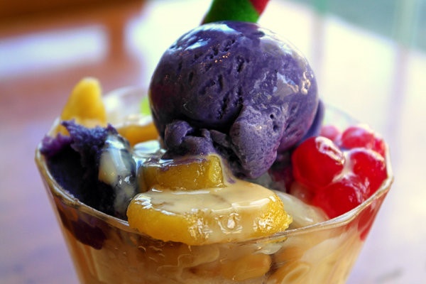 Halo-Halo là món tráng miệng tuyệt ngon ở Philippines với đá bào trong cốc hoặc bát, sau đó được phủ lên bởi trái cây, xi rô, trân châu, thạch, mứt khoai lang tím... |