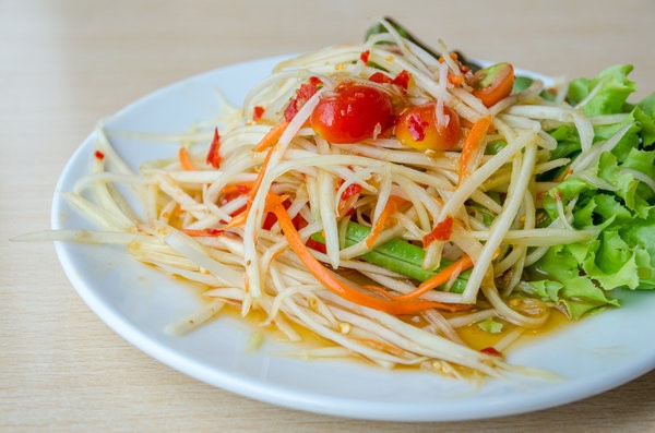 Green Papaya của Thái Lan là món salad cực đơn giản với nguyên liệu từ đu đủ xanh trộn với với tôm khô, ớt và chanh tạo nên vị chua cay nhẹ. |