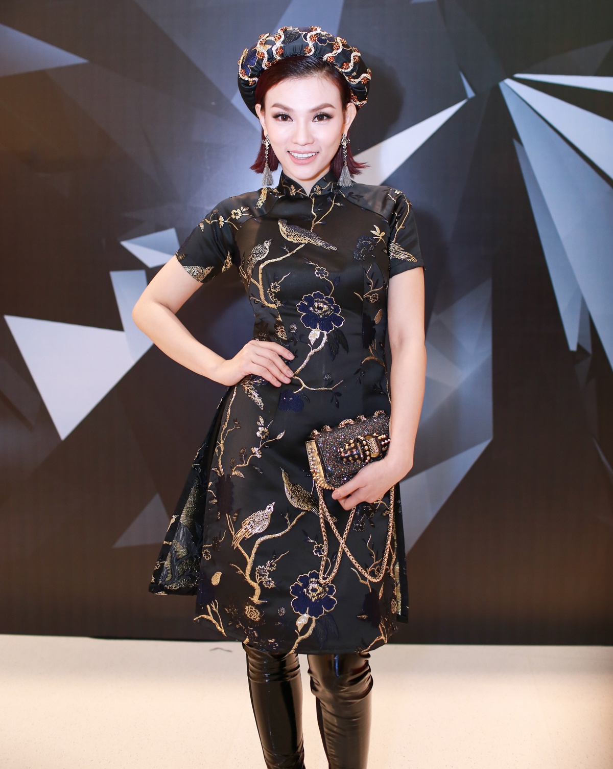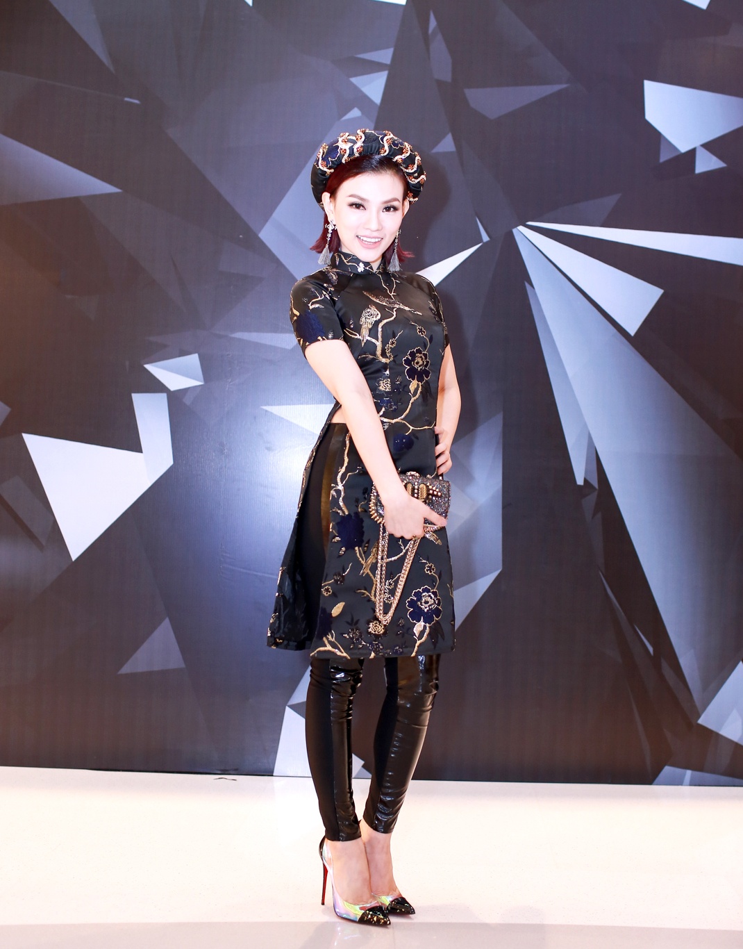 Tối 30/12, Thu Thủy tham gia một sự kiện thời trang tại TP HCM. Nữ ca sĩ diện chiếc áo dài cách điệu được nhà thiết kế Nhật Dũng làm riêng cho cô, kết hợp với quần da bóng. |