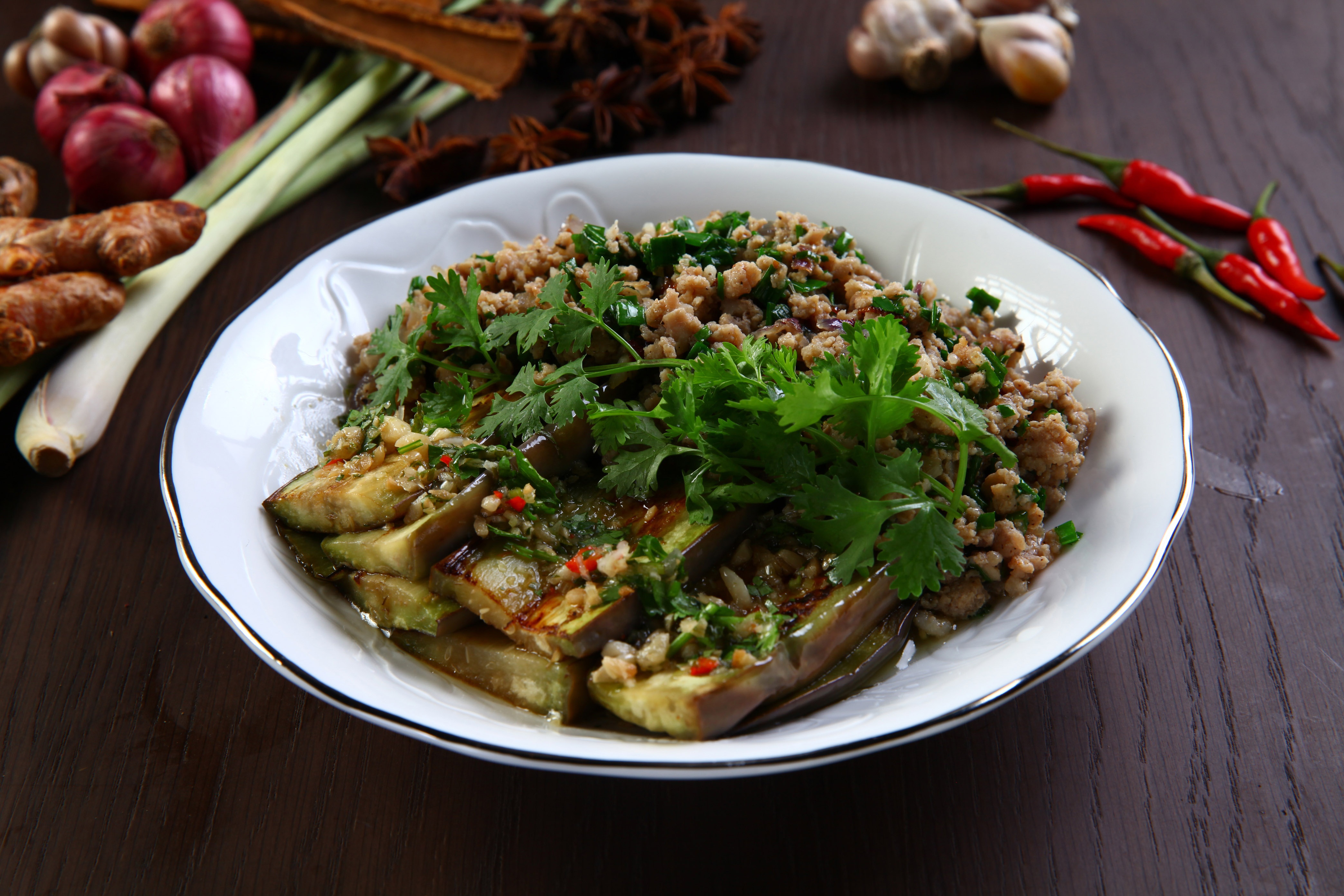 Khi cà chín, xếp cà ra đĩa, cho thịt xay lên, cuối cùng, rưới hỗn hợp nêm vừa xào vào. Rải ngò rí lên trên để trang trí. Món này ăn nóng với cơm.