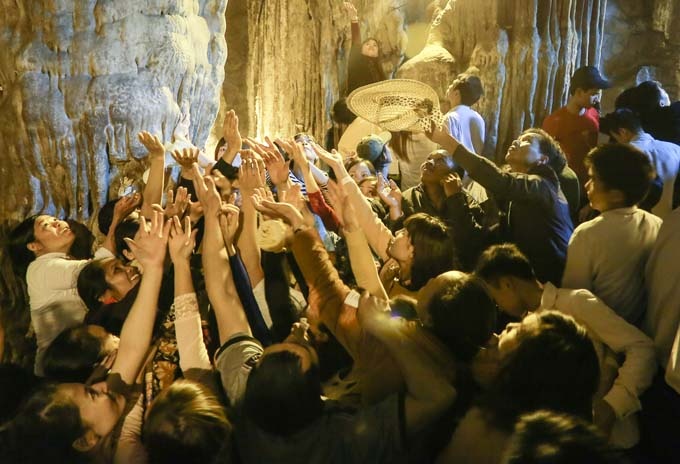 | Chen nhau hứng nước thạch nhũ để cầu may mắn tại động Hương Tích, chùa Hương (Hà Nội). |