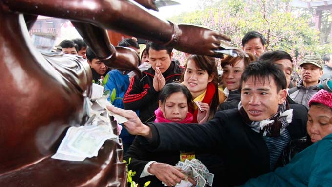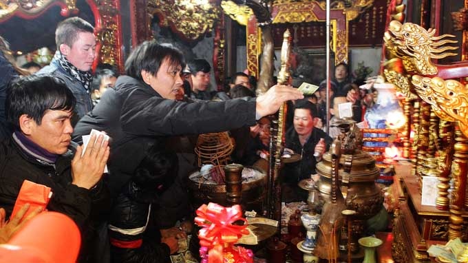 | Một du khách cố thả tiền lên bàn thờ tại đền Trần, Nam Định để cầu may. |