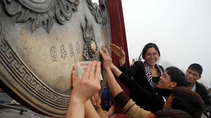 | Chen nhau cọ tiền vào khánh đồng trên chùa Yên Tử mong cầu tài. |