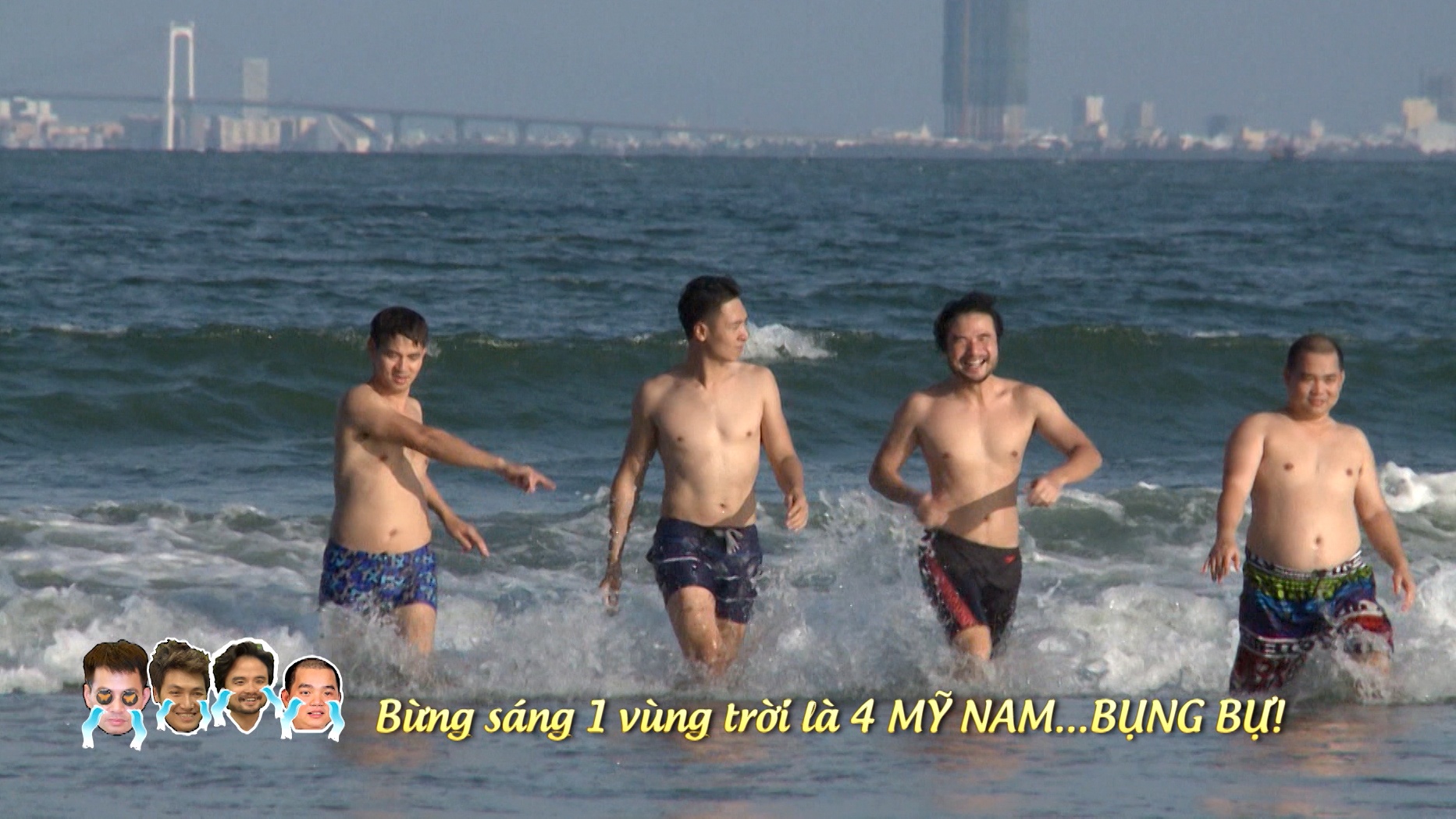 Sau những tiếng cười hạnh phúc hay cảm xúc dâng trào khi gặp lại người thân trong ngày đầu tiên ở làng chài Kim Liên, hành trình của các cặp bố con được tiếp tục với trải nghiệm mới cùng biển xanh và nắng vàng. Khoảnh khắc "khoe thân" của 4 ông bố đem lại nhiều tiếng cười cho khán giả. |