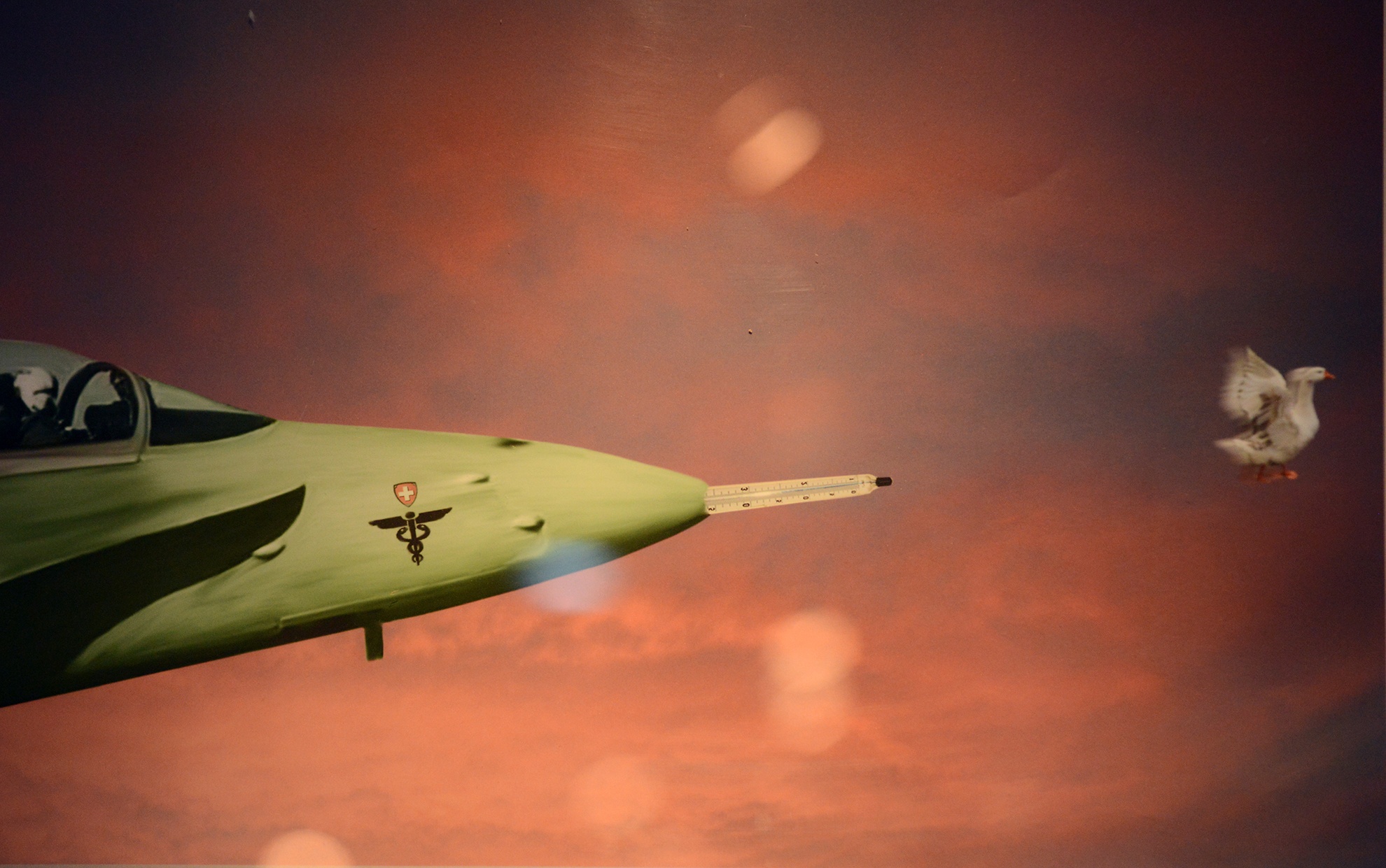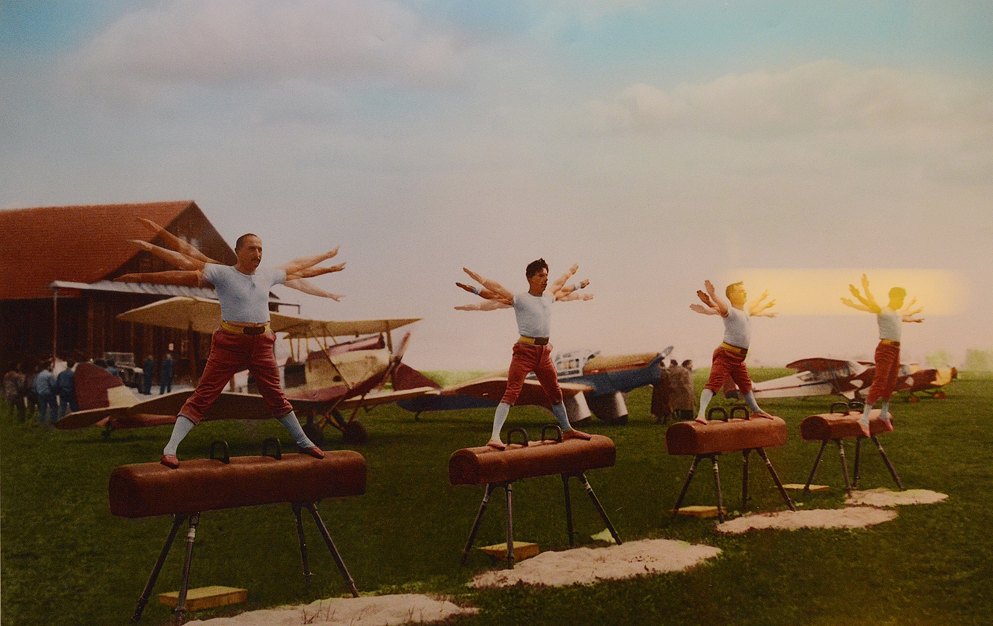 | Tác phẩm "Cất cánh" mô tả máy bay đuổi theo một chú vịt trên bầu trời. |