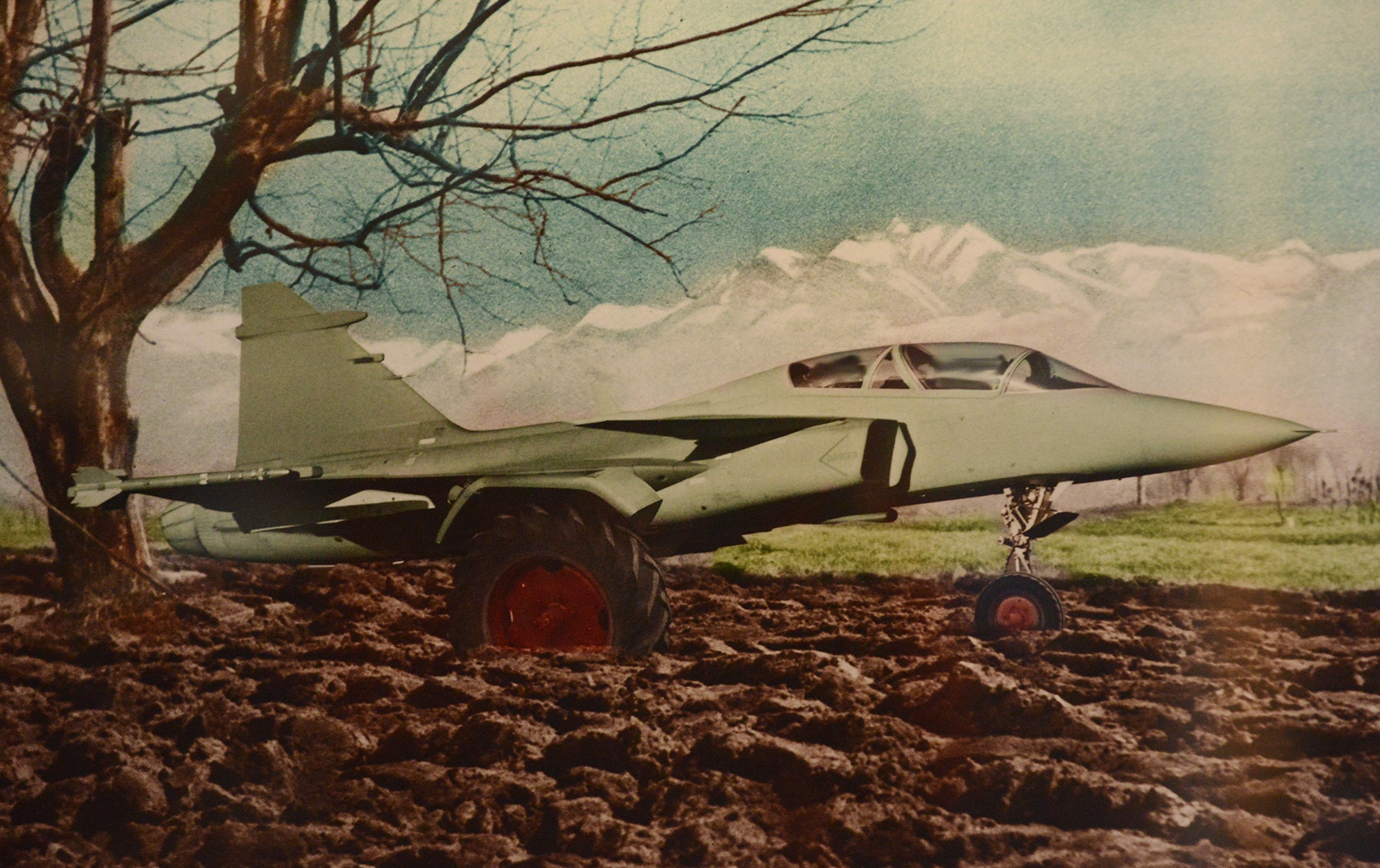 | "Máy bay Gripen cất cánh" với hình ảnh bánh lái thiết kế từ lốp máy kéo phục vụ nông nghiệp. |