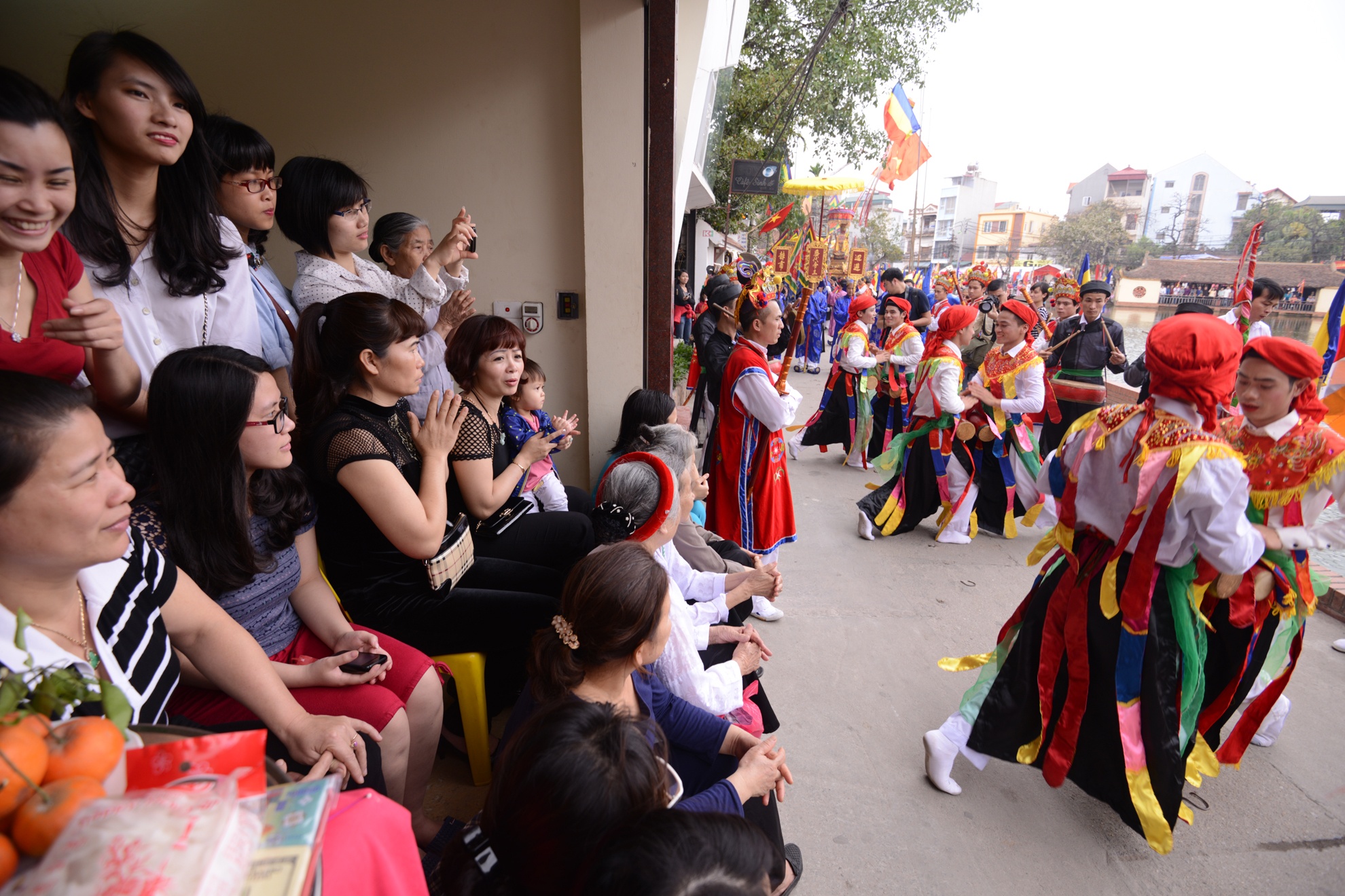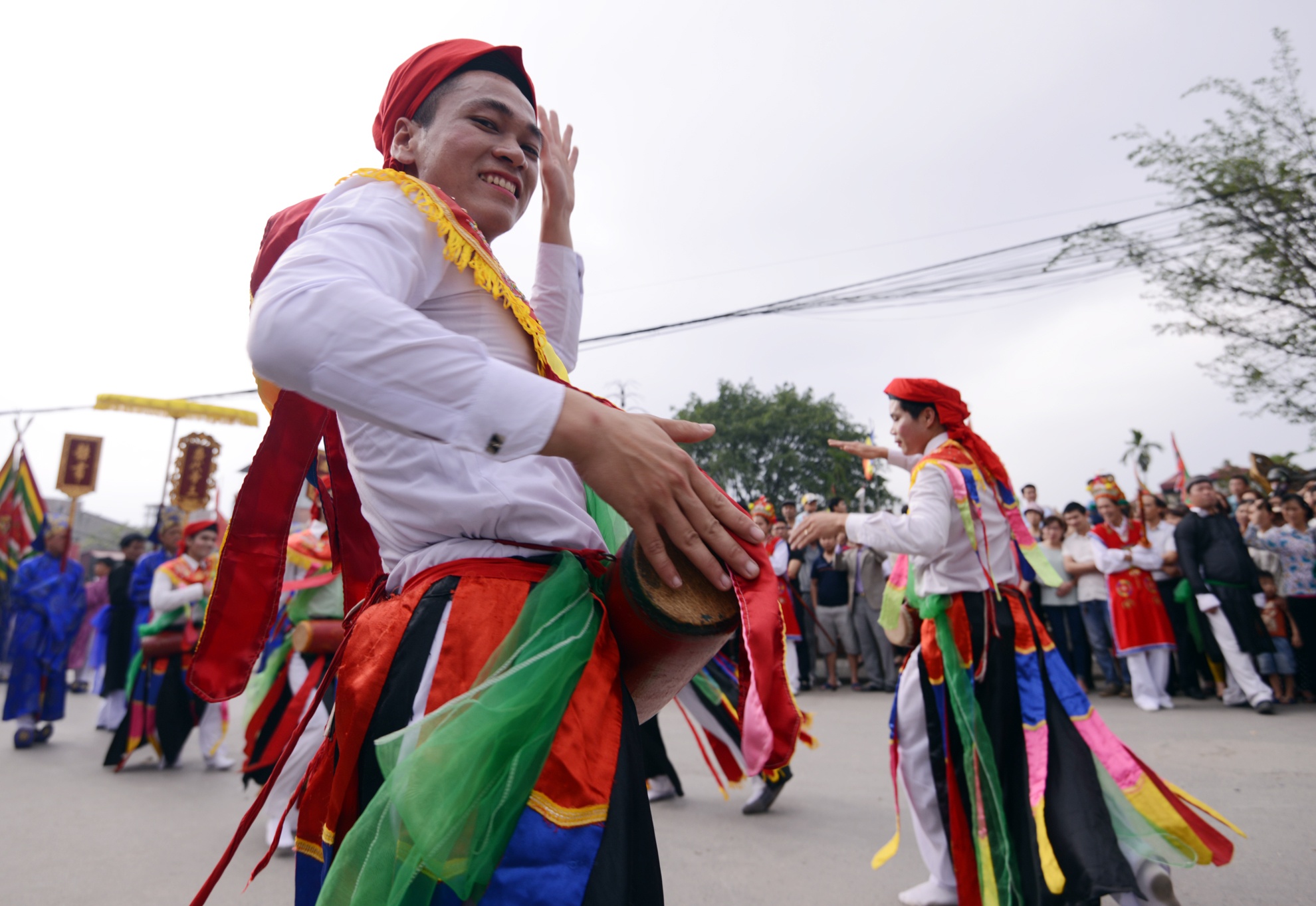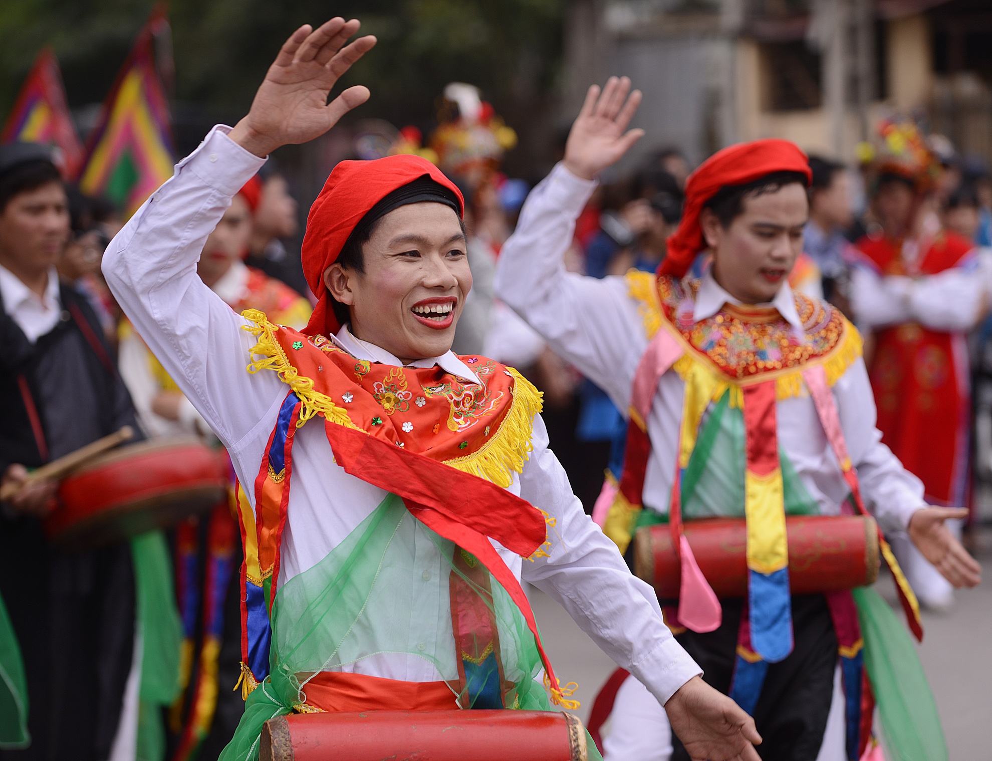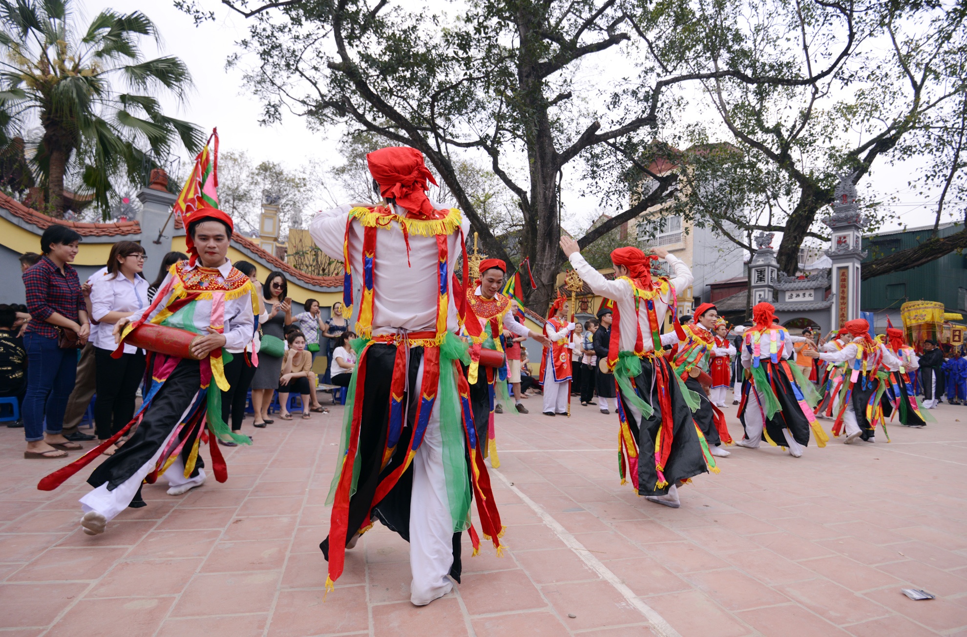 Chiều 27/2, hơn chục chàng trai người làng Triều Khúc (Hà Nội) chít khăn mỏ quạ, má phấn môi son cùng nhau diễn điệu múa bồng cổ thu hút đông đảo du khách từ khắp nơi đổ về xem.