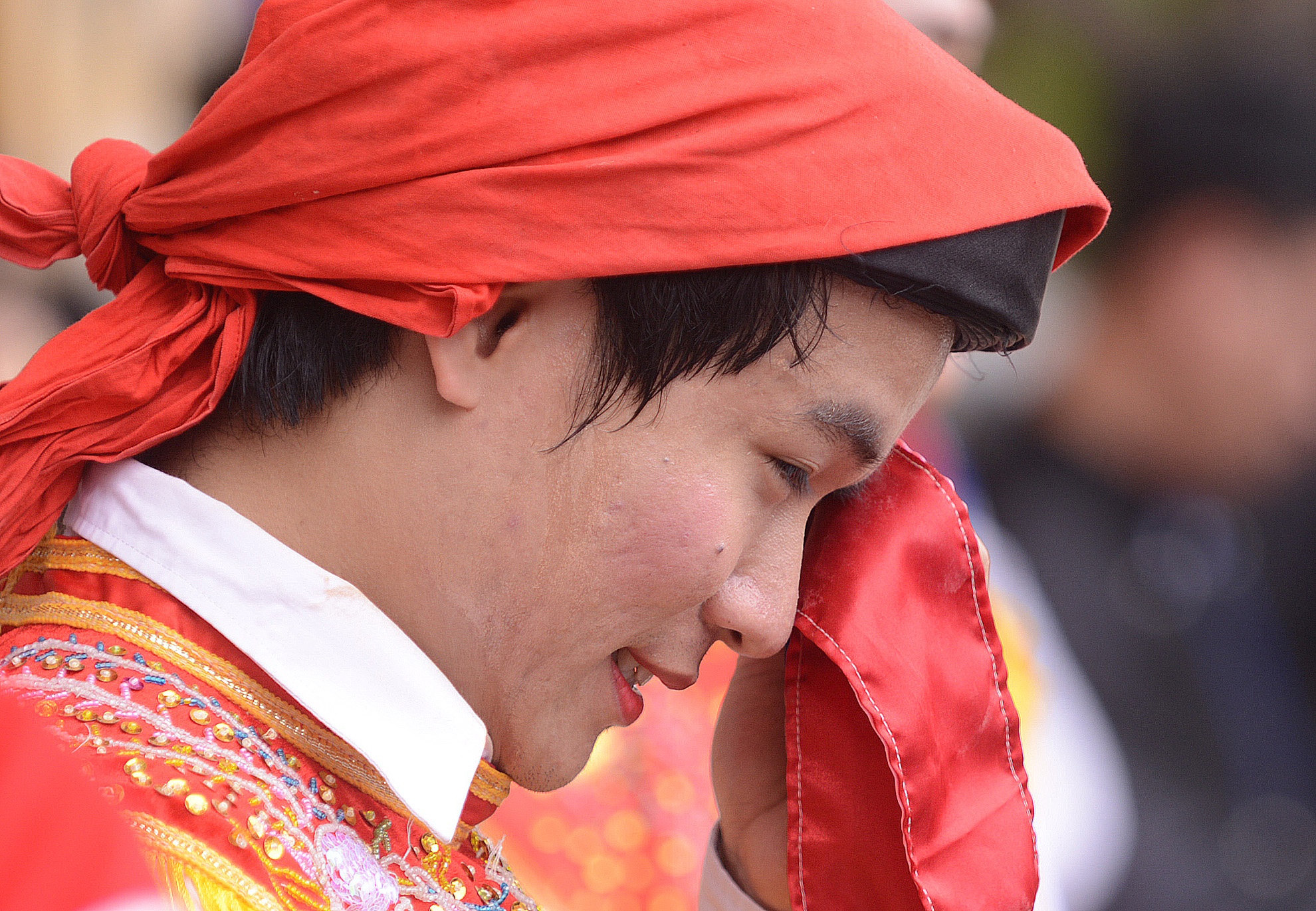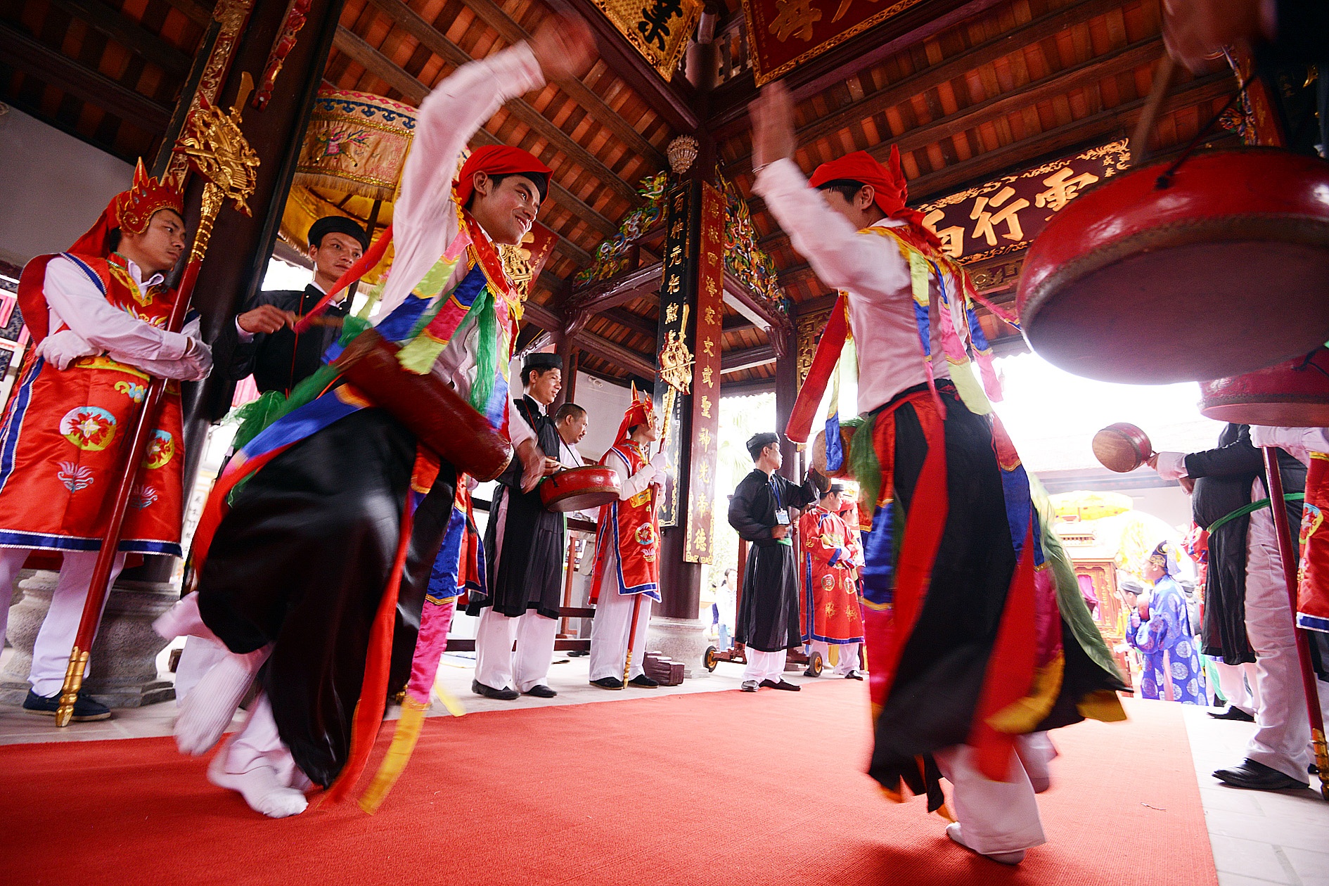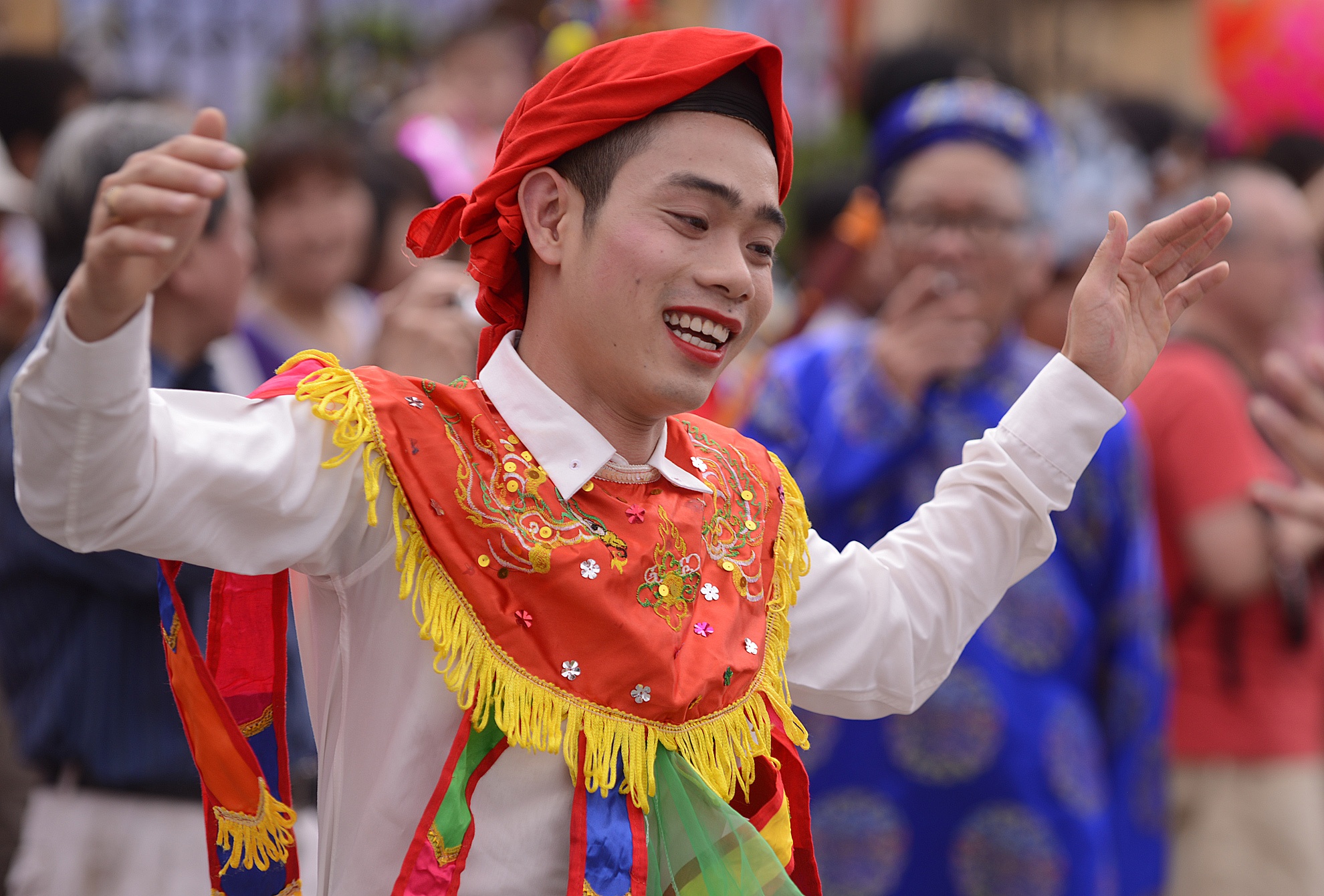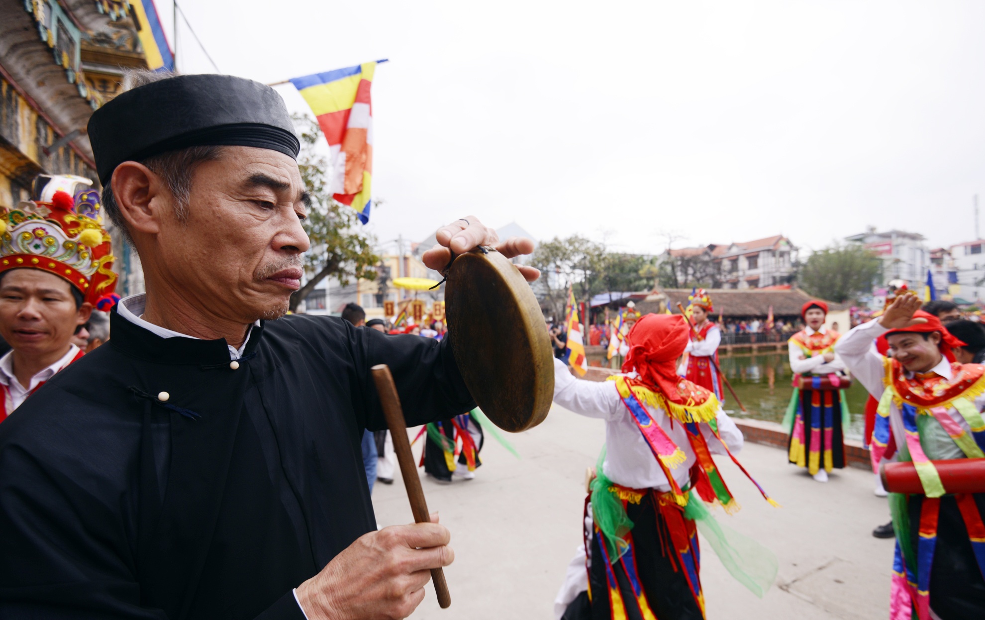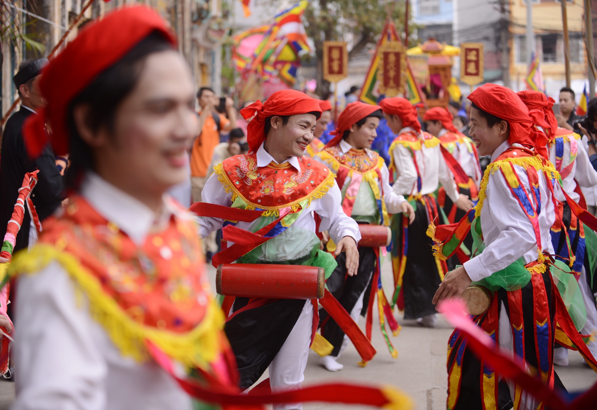 Chiều 27/2, hơn chục chàng trai người làng Triều Khúc (Hà Nội) chít khăn mỏ quạ, má phấn môi son cùng nhau diễn điệu múa bồng cổ thu hút đông đảo du khách từ khắp nơi đổ về xem.