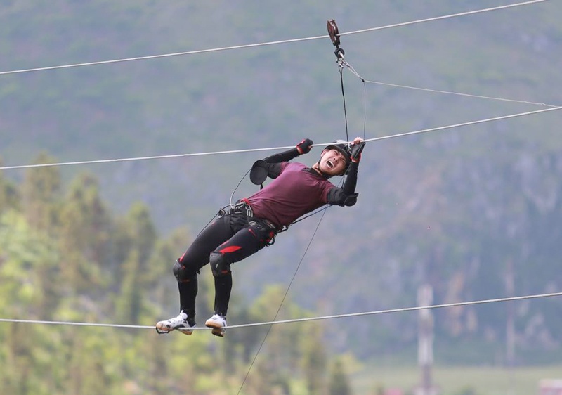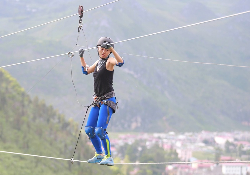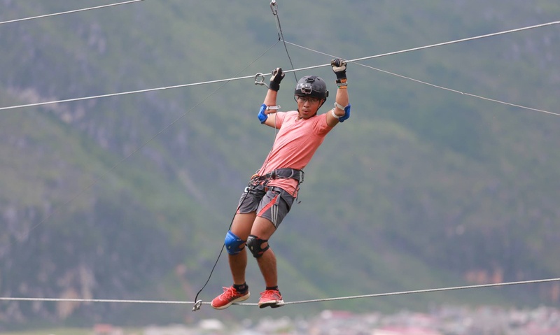 | Một trong số đó là thử thách đi trên dây, vượt qua quãng đường hơn 200m nối giữa 2 mỏm núi đá chênh vênh, hiểm trở. Khoảng cách từ dây cáp xuống các mỏm đá tai mèo sắc nhọn là khoảng 60m. |