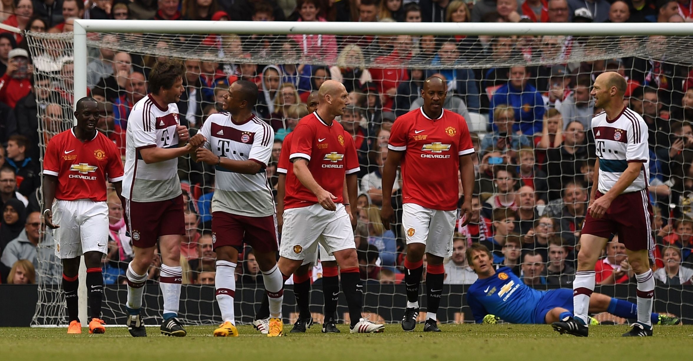 | Huyền thoại M.U giành chiến thắng với tổng tỷ số 7-5 sau 2 lượt trận. Mục đích của trận cầu là bán vé gây quỹ từ thiện. Ảnh: Mirror. |