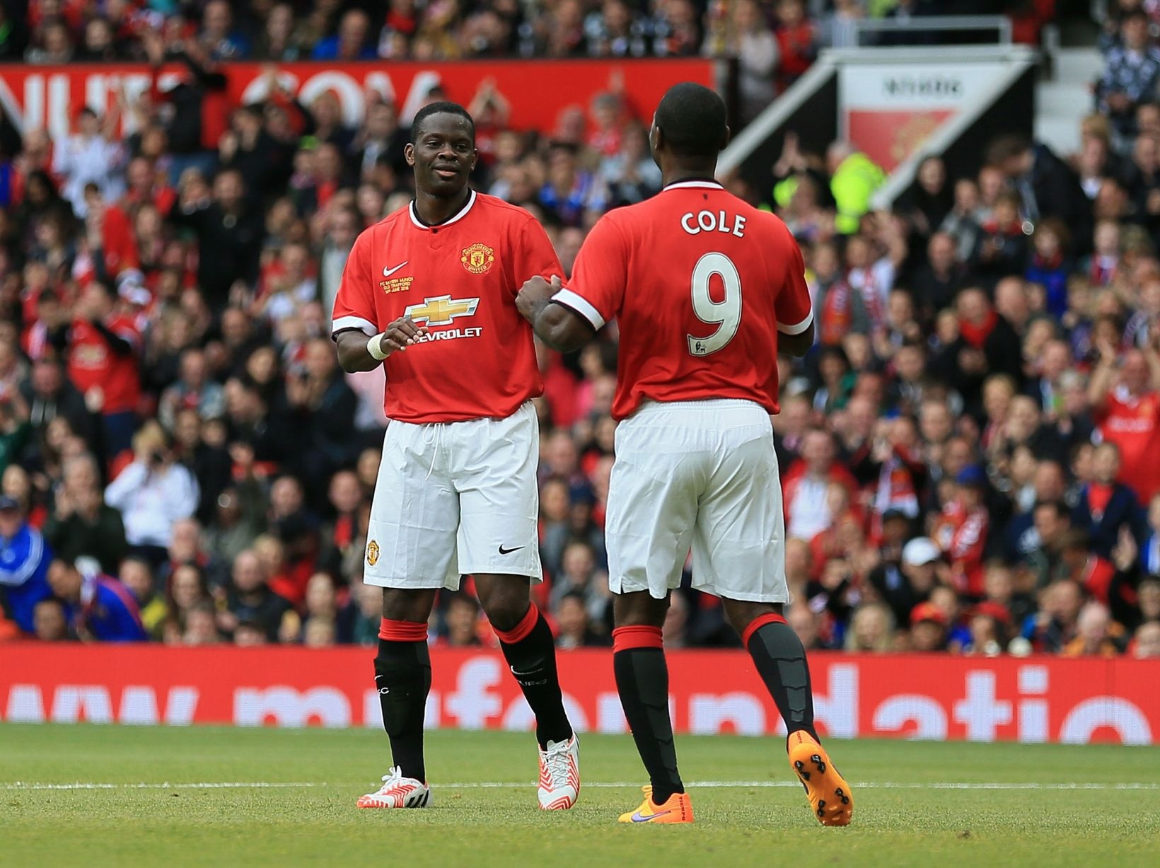 | Cựu tuyển thủ Pháp ăn mừng bàn thắng cùng Andy Cole. Ảnh: Mirror. |