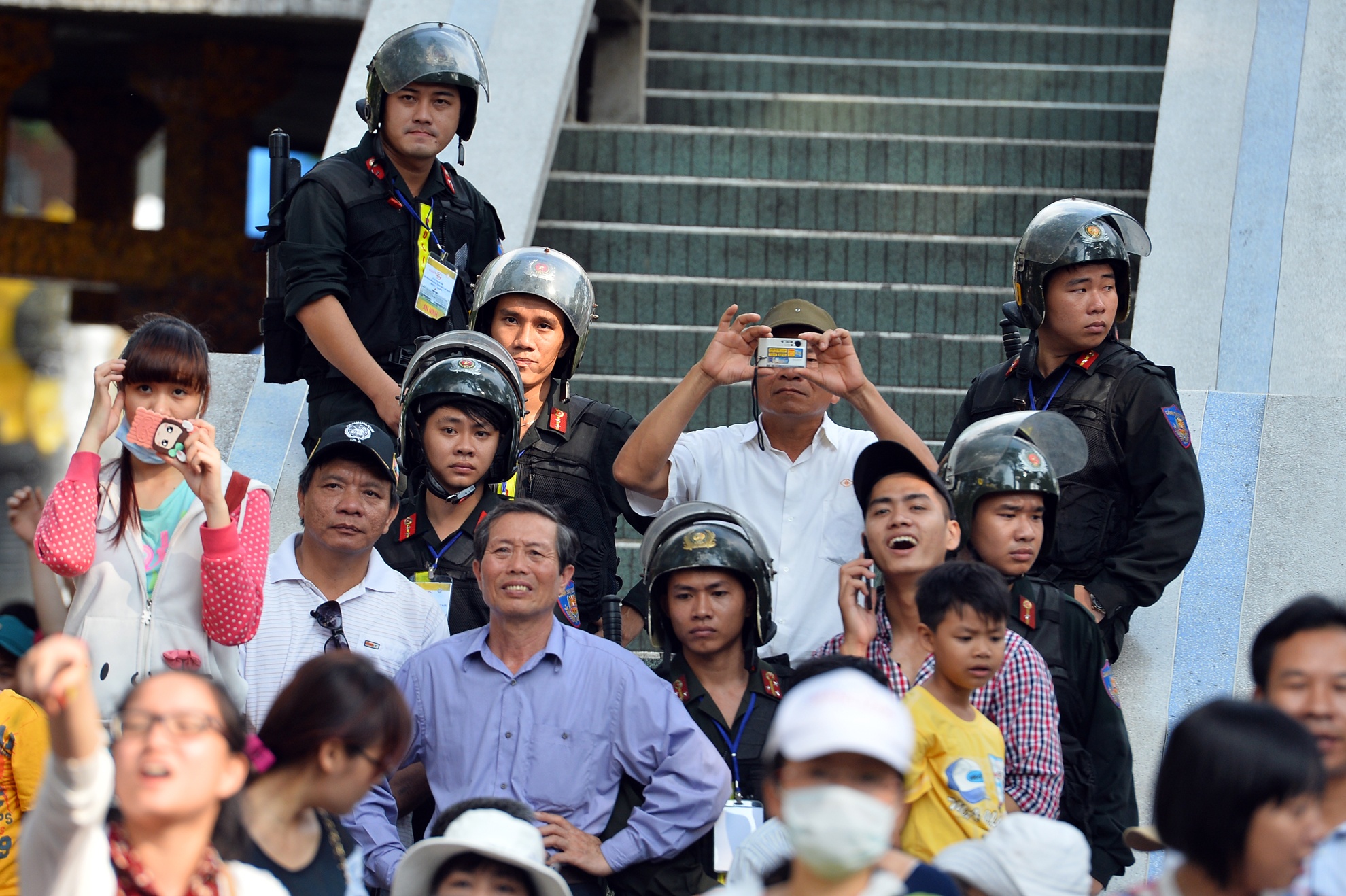 | Hàng nghìn người dân đứng tại các chốt cấm đường để đón xem nghi thức diễu binh, diễu hành kỷ niệm 40 năm giải phóng miền Nam, thống nhất đất nước ngay từ 6h sáng. |