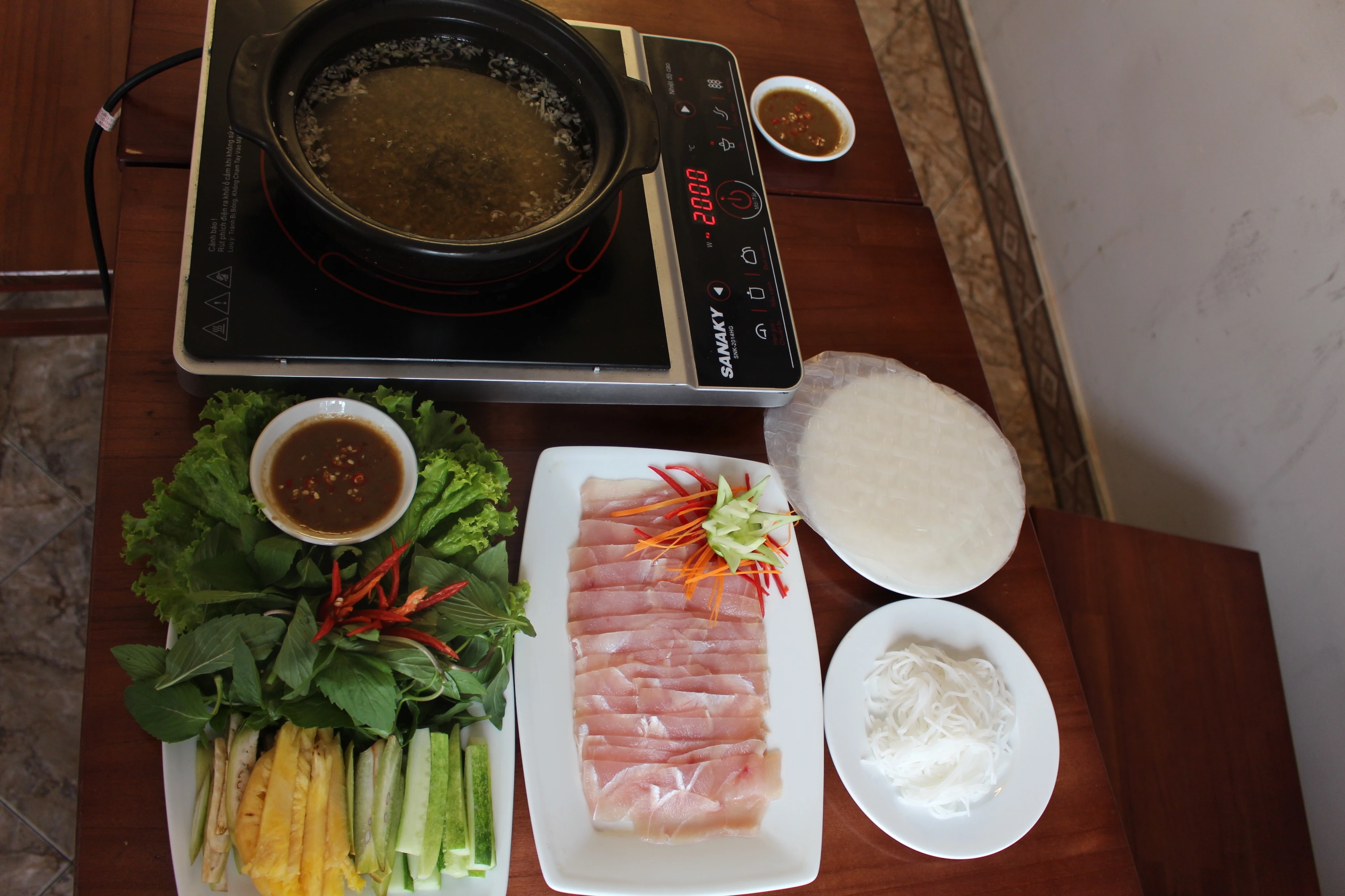 Cá cờ nhúng dấm có giá 99.000 đồng một phần dành cho hai người. Đây là mức giá tốt cho bữa ăn sáng trong nhà hàng máy lạnh. Nếu không thích lích kích với nhúng cuốn, bạn có thể đổi sang món lẩu cá cờ đồng giá.