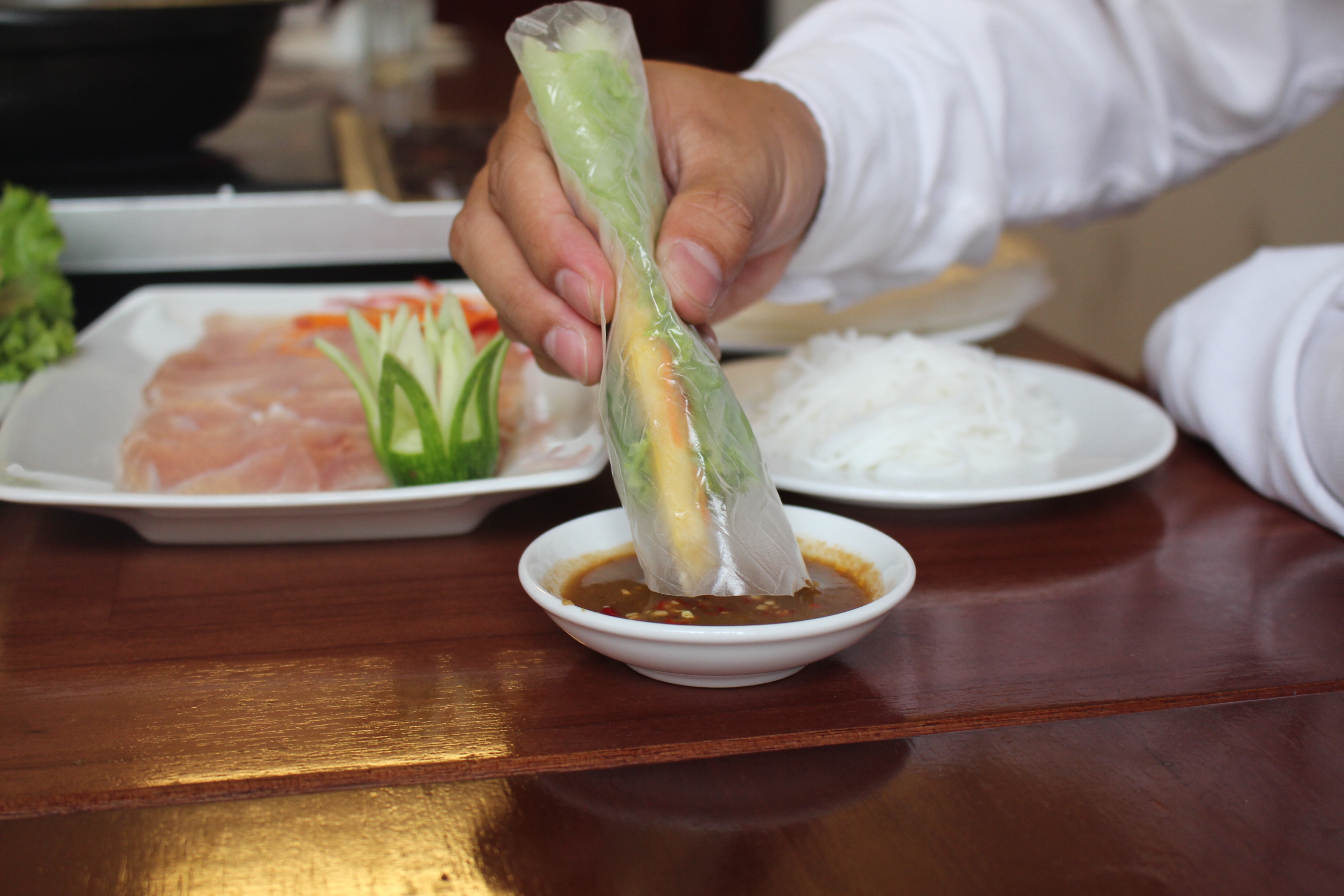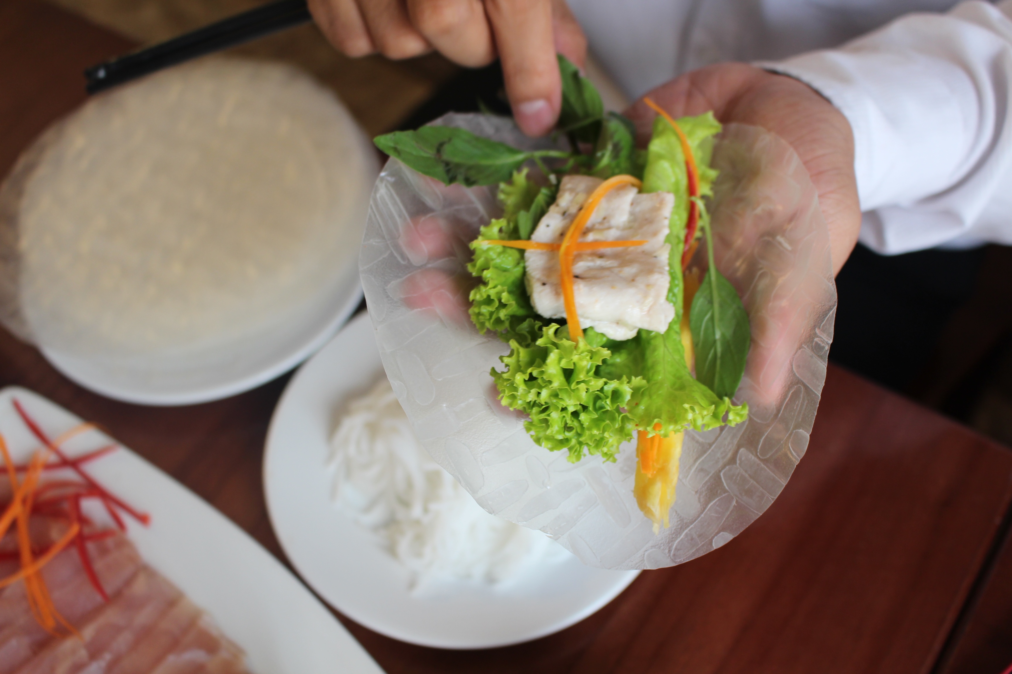 Nếu chưa đủ novới món nhúng giấm hay lẩu, bạn có thể thử chả giò cá cờ. Chả giò cá cờ có phần nhân gốm bún gạo, nấm mèo, cà rốt... riêng, phần thịt heo, tôm hay cua thông thường được thay bằng cá cờ băm nhuyễn. Thành phần này giúp món ăn thêm thơm ngon, lạ miệng.