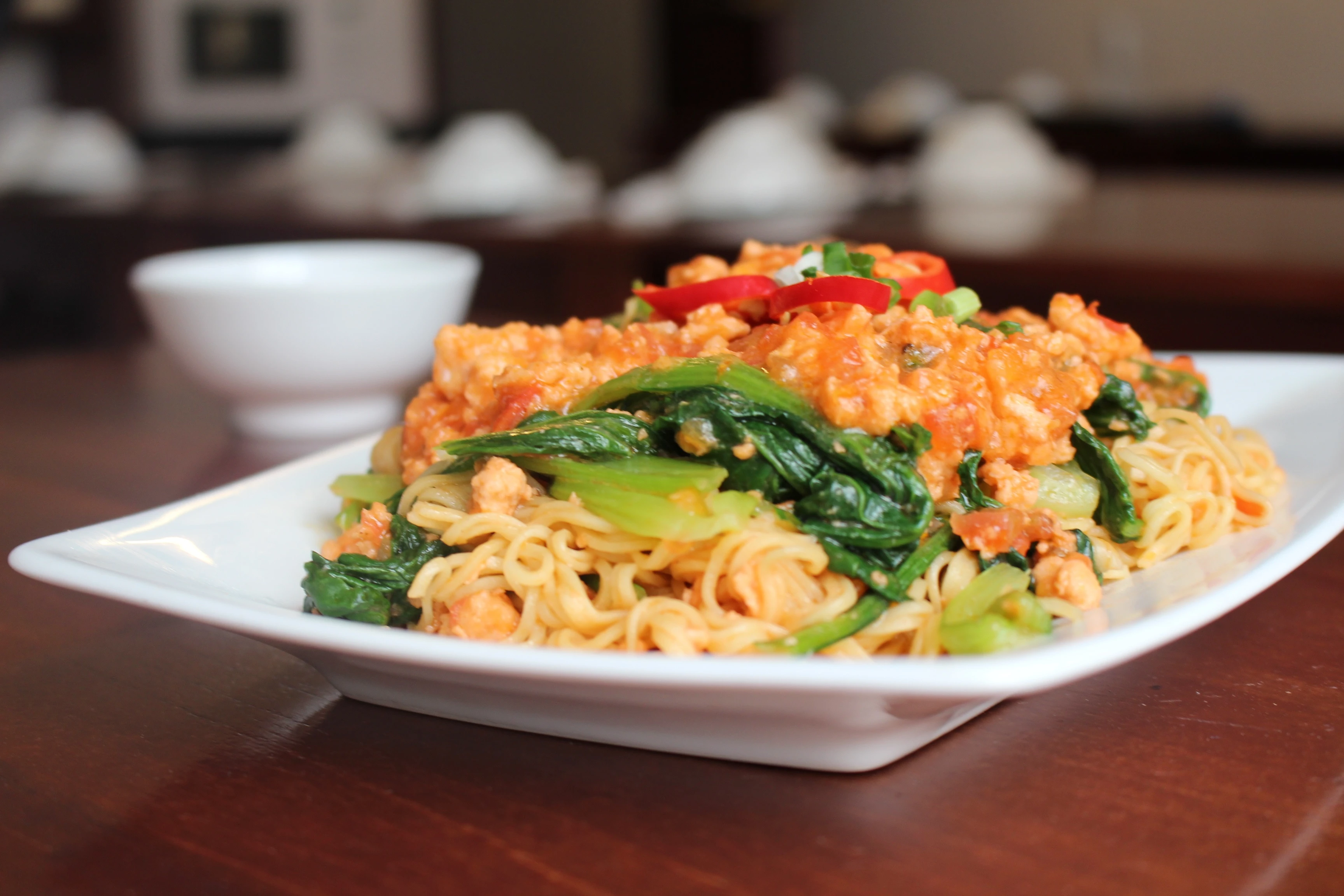 Những ai nghiện mì tôm có thể chọn mì tôm xào cá cờ. Điểm nhấn của món ăn là phần sốt được làm từ cá cờ băm nhuyễn, cá chua, gia vị và phô mai. Phần sốt này được chế biến theo công thức sốt làm mì Ý.