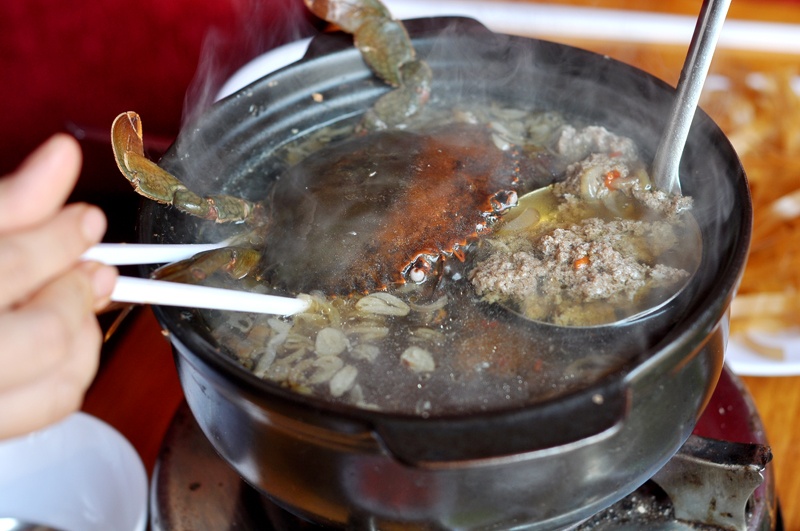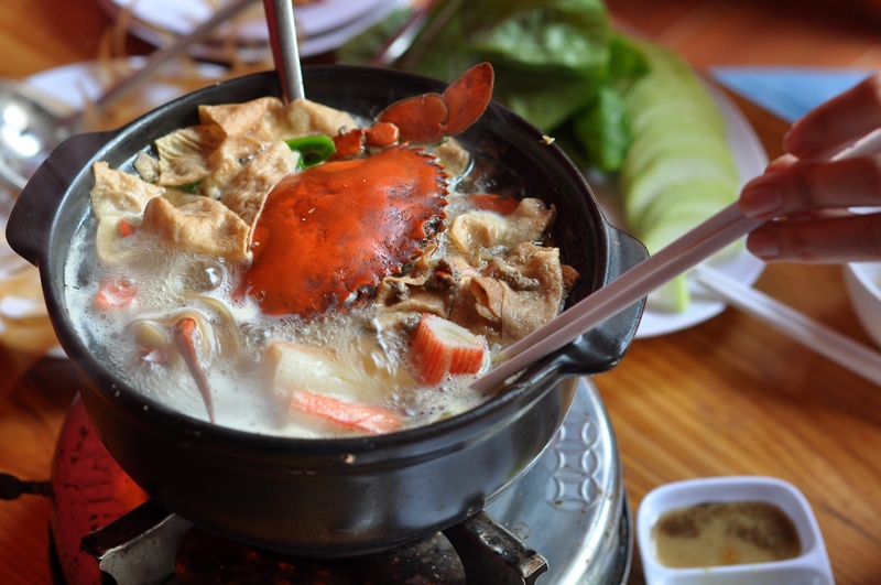 Một “bộ sưu tập” các món cua tất nhiên không thể thiếu vắng lẩu. Lẩu cua quán này có tới 3 loại cua – cua đồng đã xay nhỏ trong nước lẩu như món canh riêu quen thuộc; cua tươi nguyên con và thanh cua Nhật mềm ngọt mát. Chỉ cần biết vậy thôi bạn đã có thể tưởng tượng ra độ đậm đà, ngọt chất. Lẩu cua ở đây kết hợp với mồng tơi, mướp nên hương vị thanh mát, thích hợp cho mùa hè.