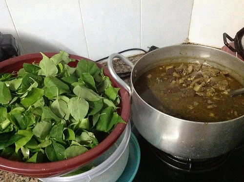 Tô gié nóng hổi, nước gié màu nâu hơi có chút ánh xanh. Dọn thêm bún tươi, rau sống và bánh tráng mè nướng. Mùi cay nồng của ớt, gừng, sả, vị chua của lá giang, vị ngọt thanh của nước dừa, vị đắng nhẹ của gié, vị nhân nhẫn của mật bò ăn với bún và rau sống thật hợp.