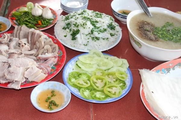 Cháo khá loãng, nấu bằng huyết ninh với thịt nạc băm. Cạnh tô cháo nóng là đĩa lòng heo với những miếng gan dày, miếng dồi màu nâu, khoanh tròn bên cạnh những miếng tim deo dẻo, miếng cổ dai dai giòn giòn, miếng bầu dục mong mỏng. Những thứ này ăn kèm với bánh hỏi, khiến bánh hỏi trở nên béo bở, ngon ngọt khác thường.