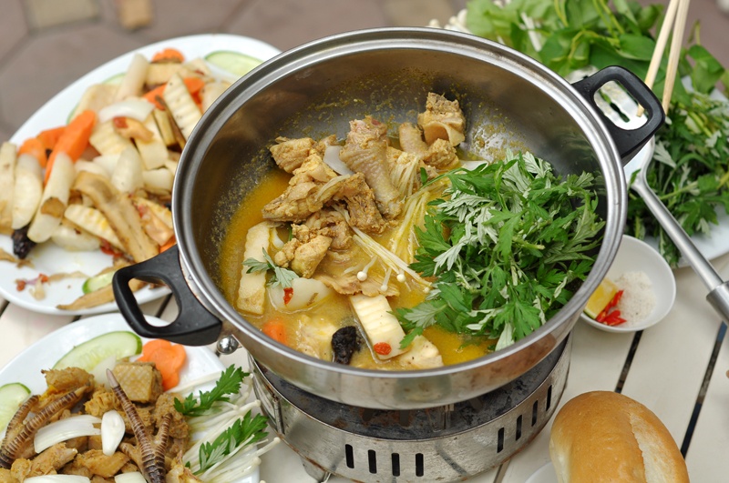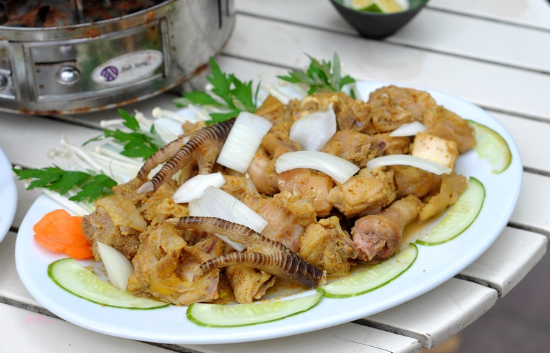 Lẩu khô gà trông rất lạ gồm có thịt gà đã qua sơ chế và các loại rau củ. Không có canh đầy ắp, trong nồi chỉ có chút nước pha chế đặc biệt đủ để khách trộn đều thịt và rau củ rồi thưởng thức. Lẩu khô gà rất đậm đà, lạ miệng, ăn kèm bánh mì khá thú vị.