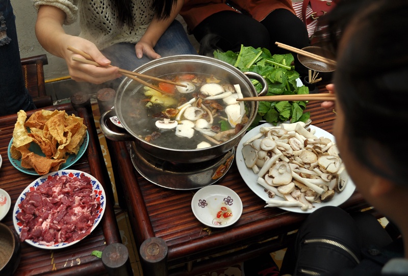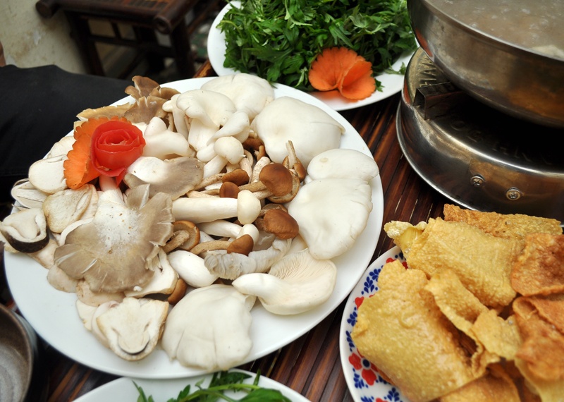 Về mùa lạnh này, quán lại càng dễ chật chội hơn khi khách thích lai rai với các món lẩu. Lẩu tại đây có đủ loại lẩu gà, bò, sườn sụn, nhúng dấm, đuôi bò hầm, tất cả đều kết hợp với nấm. Ngon nhất có lẽ là lẩu gác. Nếu ai sành hẳn sẽ biết, ăn gà ác chẳng khác nào thưởng thức một… thang thuốc bổ cực ngon, bởi giống gà ác chỉ nhỏ như con chim bồ câu nhưng nuôi rất cầu kỳ khi phải cho chúng ăn thuốc bắc mỗi ngày, thịt của nó không chỉ thơm ngon mà còn bổ dưỡng vô cùng. Thế nên lẩu gà ác hầm thuốc bắc không hề rẻ - 400.000 đồng/set có kèm nấm, váng đậu, rau.