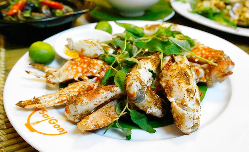 Càng ghẹ XXL rang muối, chỉ nhìn qua màu đỏ tươi lấm tấm muối ớt đã cảm thấy thèm thuồng. Vị ngọt tự nhiên của ghẹ hòa tan với vị muối ớt mằn mặn, cay cay. Đừng quên vắt thêm một trái quất lên trên, đảm bảo bạn sẽ phải mút mát đến khi nào sạch sẽ phần muối ớt bên ngoài vỏ mới thôi.