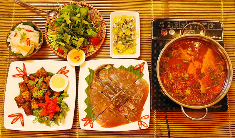 Lẩu cá đuối măng chua - thịt cá mềm mềm, dai dai xen lẫn phần sụn giòn ăn kèm với măng trắng giòn sừng sực rất “khoái”.