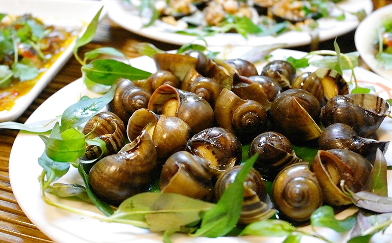 | Ốc nhồi nướng tiêu đen - vừa ăn vừa húp nước bên trong để cảm nhận vị cay cay, ấm ấm của tiêu đen và vị ngọt béo của ốc. |