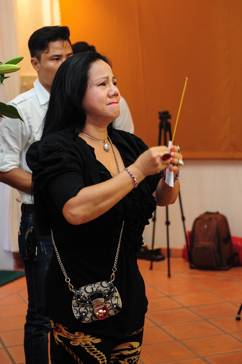 | Bà Kim Loan - mẹ ca sĩ Ngọc Sơn đến tư gia thắp hương Giáo sư lần cuối. Gương mặt bà đượm buồn trước sự ra đi của người thầy âm nhạc đáng kính. |