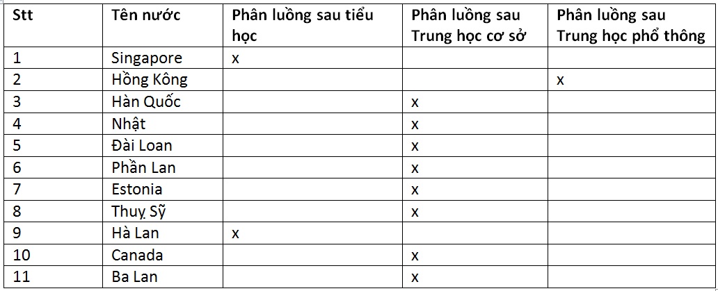 Kết quả thu được cho thấy, trong số 11 nước, có 2 nước (Singapore và Hà Lan) tiến hành phân luồng sau tiểu học; 8 nước tiến hành phân luồng sau THCS. Hồng Kông (Trung Quốc) tiến hành phân luồng sau THPT.