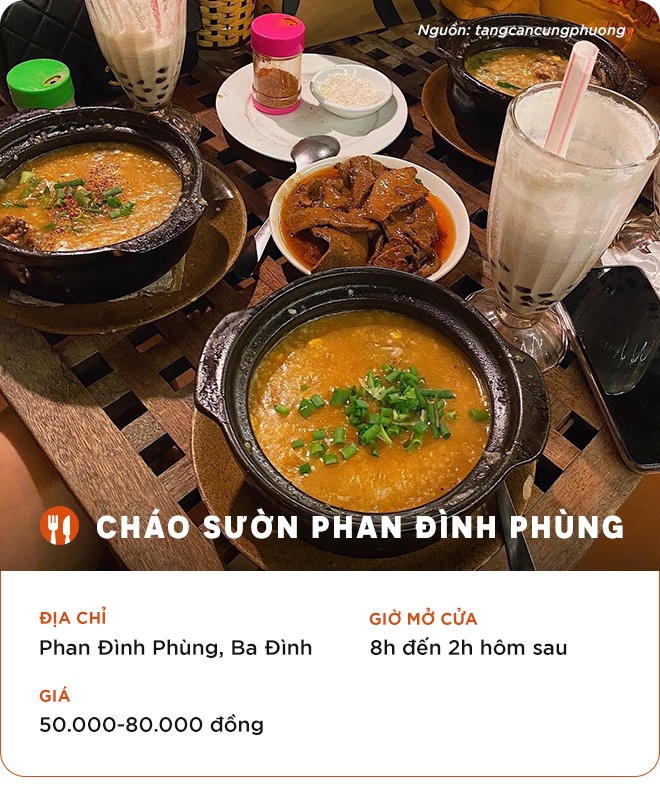 JN: "Không gian quán khá rộng rãi, có cả sân vườn cho các bạn thích ngồi ngoài hóng gió và ngắm phố phường. Thực đơn rất đa dạng từ trà sữa, trà cho đến cháo. Cháo sườn ngô khi bưng ra vẫn sôi sùng sục. Gia vị được nêm nếm vừa vặn, sườn được nấu chín nhừ, thêm chút vị ngọt của ngô tạo nên hương vị độc đáo của riêng quán. Gan xào có nước sốt đậm vị chua ngọt, cho thêm vào cháo ăn khá là ổn".
