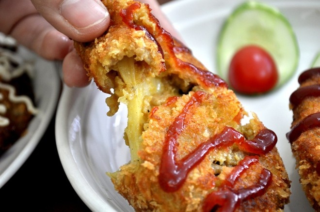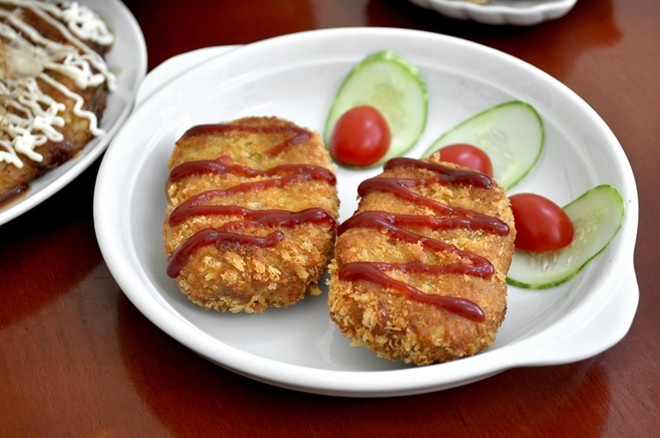 | Chủ quán cho biết, thịt viên pho mai có tên gọi Menchi Katsu. Bánh có lớp vỏ chế biến từ bột chiên, trứng và thịt băm nhuyễn, phần nhân bên trong là dải pho mai thơm ngậy. Giá món ăn khoảng 20.000-25.000 đồng. |