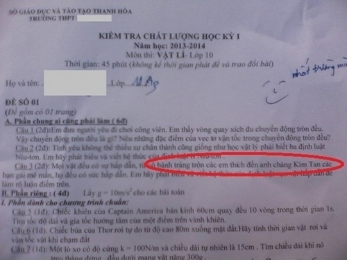 Hot boy The Heirs cũng từng có tên trong đề thi Vật lý của một trường THPT ở Thanh Hóa: “Mọi vật đều có sự hấp dẫn, từ cô bánh tráng trộn các em thích đến anh chàng Kim Tan các bạn gái mê mẩn, họ đều có sức hấp dẫn. Em hãy phát biểu và viết hệ thức của định luật vạn vật hấp dẫn để làm rõ luận điểm trên”.