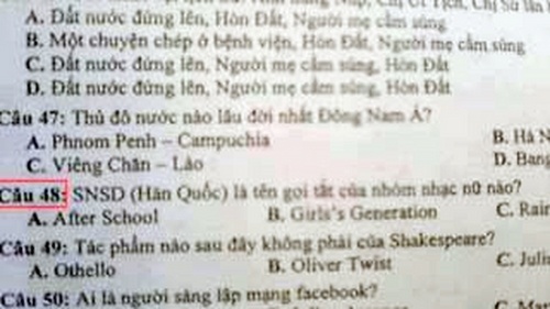Trong cuộc thi diễn ra tại trường đại học có hình thức giống gameshow Rung chuông vàng gồm 100 câu hỏi về kiến thức văn hóa - xã hội, SNSD được đề cập trong câu hỏi số 48 với nội dung: “SNSD (Hàn Quốc) là tên gọi tắt của nhóm nhạc nữ nào?”. Câu trả lời gồm có 3 đáp án để lựa chọn gồm After School, Girl’s Generation và Rainbow. Tuy nhiên, ngay sau khi hình ảnh đề thi được đăng tải, nhiều luồng ý kiến trái chiều, một số fan Kpop rất phấn khích về điều này, một số lại cho rằng, ngôi sao Việt Nam thiếu gì phải đưa nhóm nhạc nước ngoài vào đề thi.