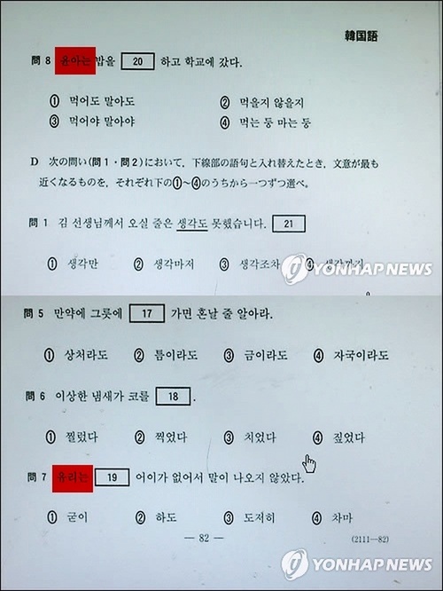 Tên của Yuri và Yoona được đề cập trong phần thi ngôn ngữ tiếng Hàn. Yuri xuất hiện trong câu điền từ số 7: “Yuri không thể thốt nên lời vì cô ấy quá ngạc nhiên”, còn YoonA được đề cập trong câu hỏi kế tiếp: “YoonA vội vã ăn sáng và đi học”.