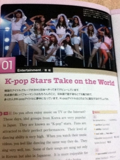 Trước đó, SNSD cũng trở thành chủ đề được đưa vào sách tiếng Anh của Nhật Bản: “Sao Kpop vươn ra thế giới”, cuốn sách nói rằng, SNSD là một nhóm nhạc nổi tiếng ở Nhật với khả năng vũ đạo và chất giọng tuyệt vời.