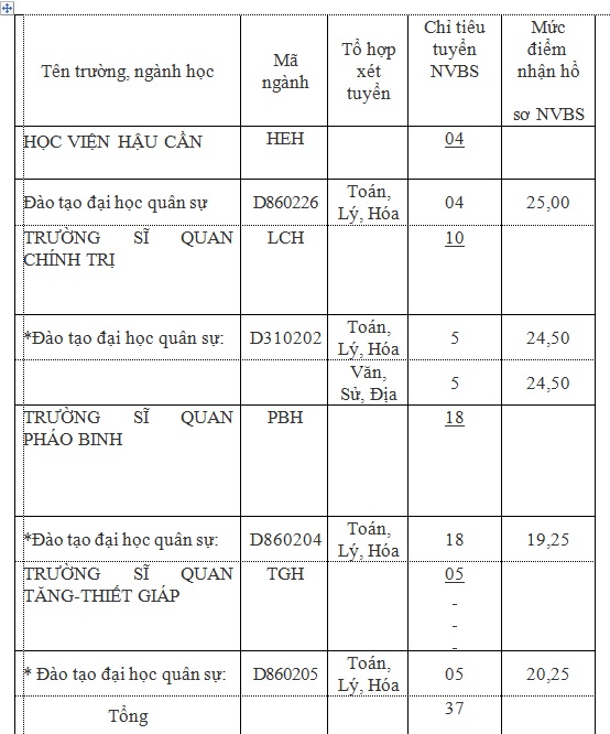 Bốn trường tuyển hệ quân sự gồm: Học viện Hậu cần 4 chỉ tiêu khối A và mức điểm nhận hồ sơ từ 25 điểm trở lên. Trường chỉ nhận thí sinh từ Quảng Bình trở ra và đủ điều kiện sức khỏe của Học viện Hậu cần, không trúng tuyển NV1.
