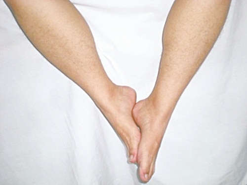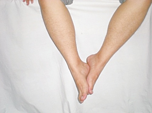 Quay cổ chân: một tay giữ gót chân, tay kia nắm phía đầu bàn chân; quay cổ chân 2-3 vòng rồi đảo chiều, tiếp tục quay cổ chân theo chiều ngược lại; rồi đẩy bàn chân vào ống chân (co tối đa) sau đó duỗi bàn chân đến cực độ.