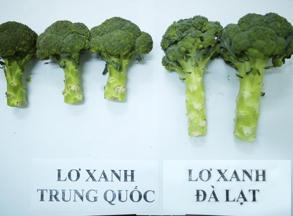 Súp lơ xanh: Súp lơ Đà Lạt có lá và cây thân đầy đủ, phần bông không đều, vị ngọt đậm. Trong khi đó, súp lơ Trung Quốc bị cắt mất phần thân bọc trong bao xốp, màu trắng, bông cuốn chặt, đều, để cả tháng tươi không bị hỏng, vị nhạt.