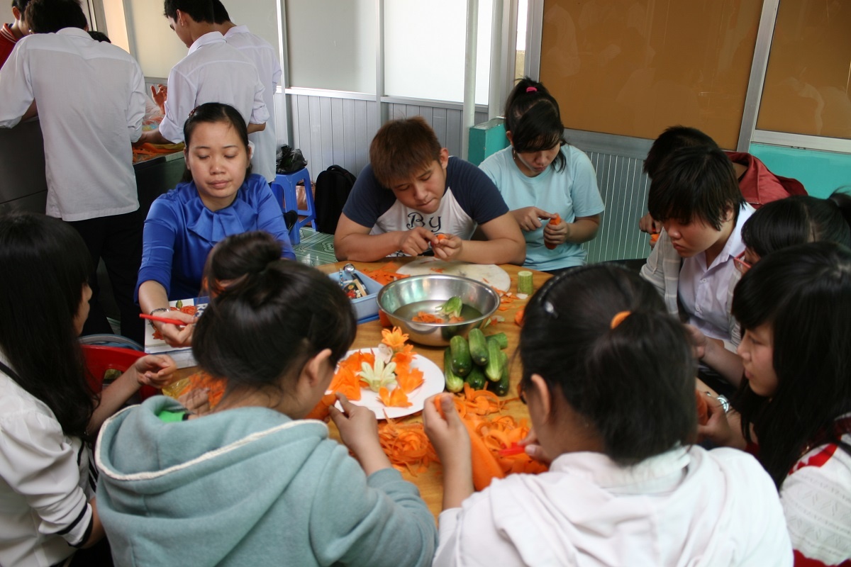 | Nâng cao kỹ năng mềm để phát triển nghề nghiệp một cách bền vững, ảnh sinh viên ngành Quản trị khách sạn học kỹ năng cắt tỉa rau củ quả. |