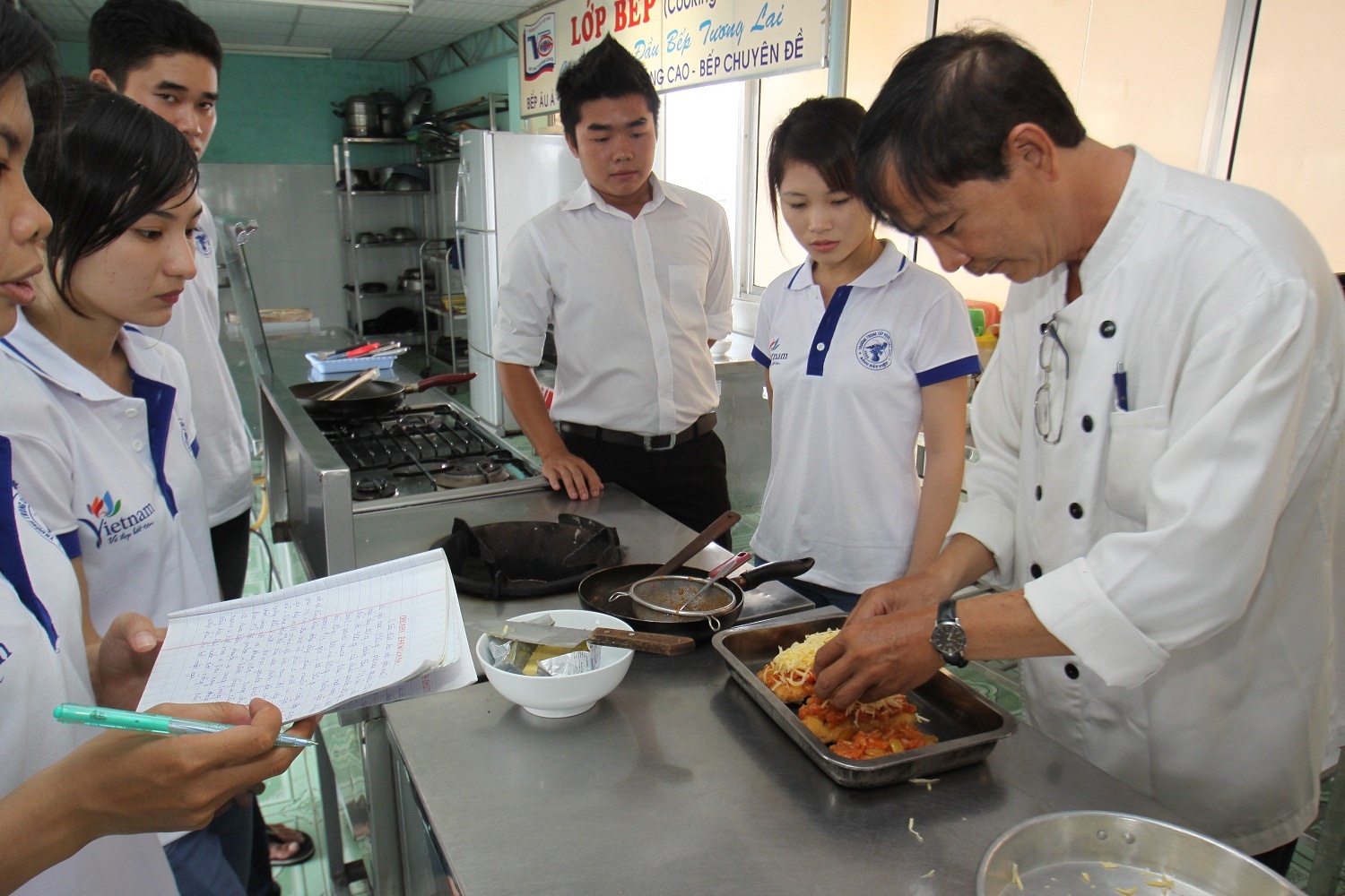 | Sinh viên đang học nghiệp vụ bếp do đầu bếp trưởng của khách sạn quốc tế 5 sao giảng dạy. |