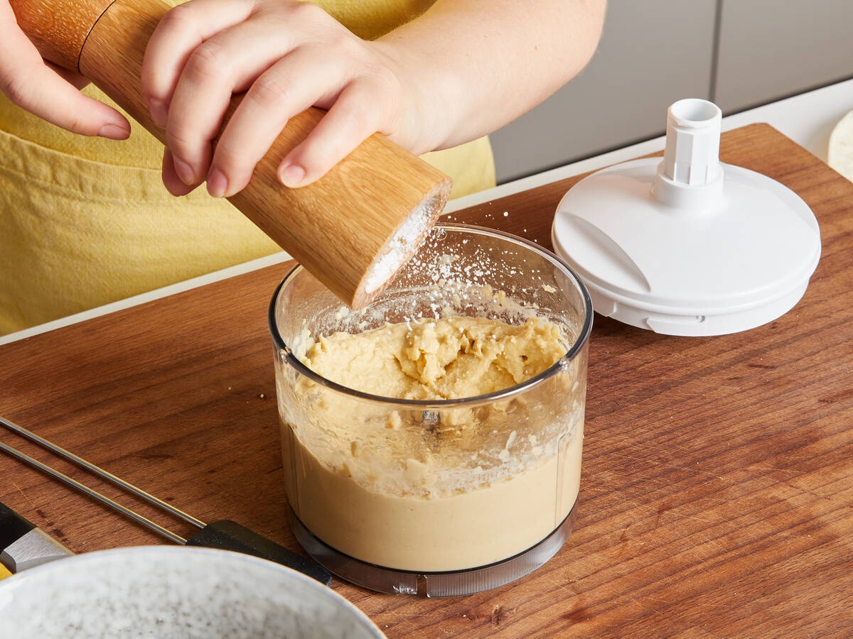 - Làm sốt hummus: Xay nhuyễn 1/3 đậu gà với một nửa sốt tahini, nước cốt nửa quả chanh, một nửa tép tỏi, 4 muỗng canh dầu olive và một ít nước lạnh. Nêm muối cho vừa ăn.