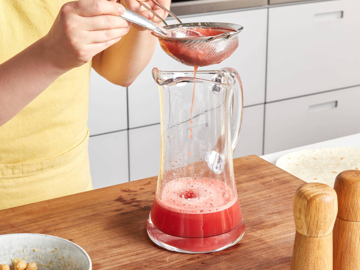 - Làm nước ép dưa hấu: Lấy 2 nắm dưa hấu đã cắt nhỏ, ép lấy nước và trộn với nước cốt chanh trong một cốc đong lớn, lọc qua rây mịn và chuyển hỗn hợp vào tủ lạnh.