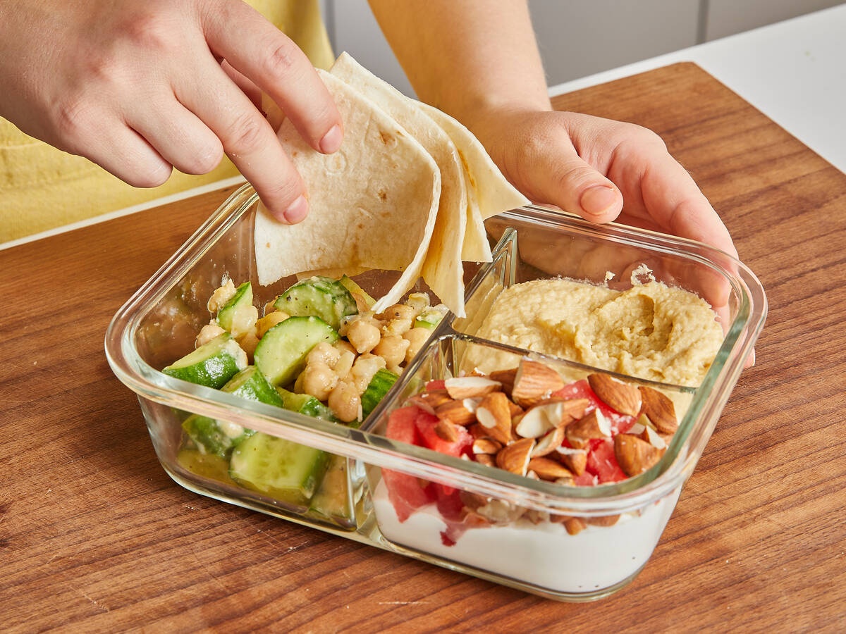 - Chia đều sốt hummus và sữa chua vào 2 ngăn còn lại của hộp.