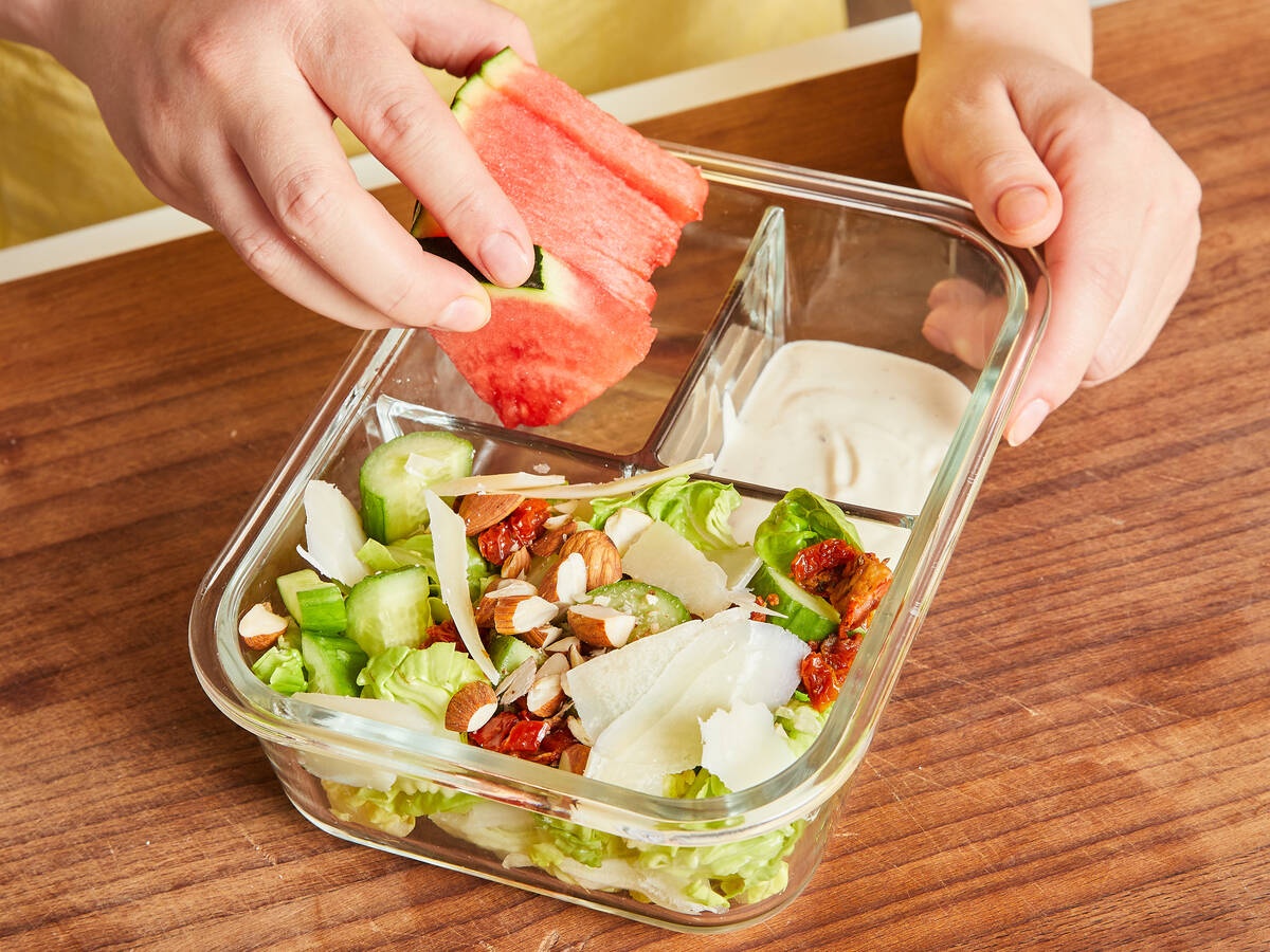 - Lấy hai nắm dưa hấu (đã cắt hình khối) và một nửa hạnh nhân cắt nhỏ cho vào ngăn có sẵn sữa chua Hy Lạp trong hộp đựng.