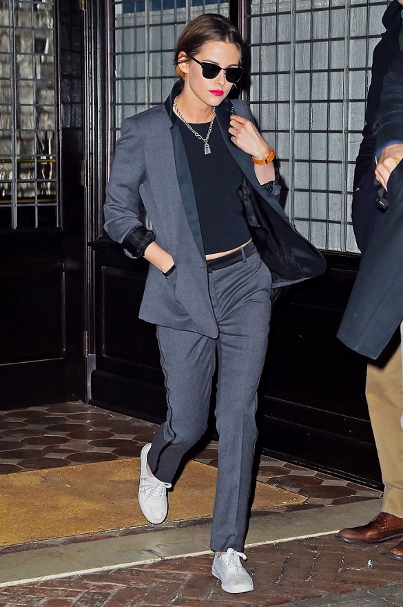 | Kristen Steward chọn phong cách menswear khi diện blazer, và điểm nhấn giúp cô khoe vẻ năng động chính là đôi giày cũng như áo thun lửng. |
