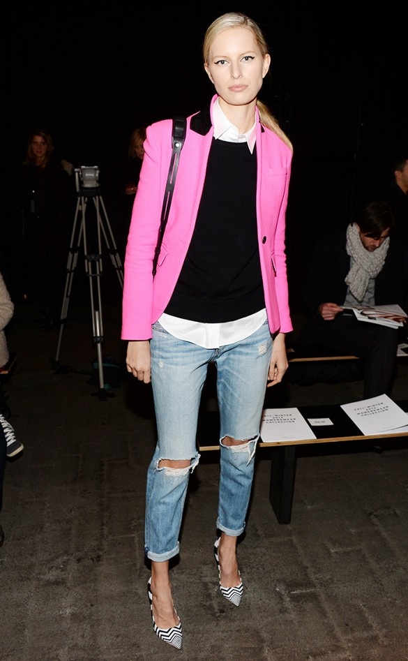 | Rosie Huntington-Whiteley chọn cách mix giày thể thao, quần jeans và áo thun khi diện blazer. |
