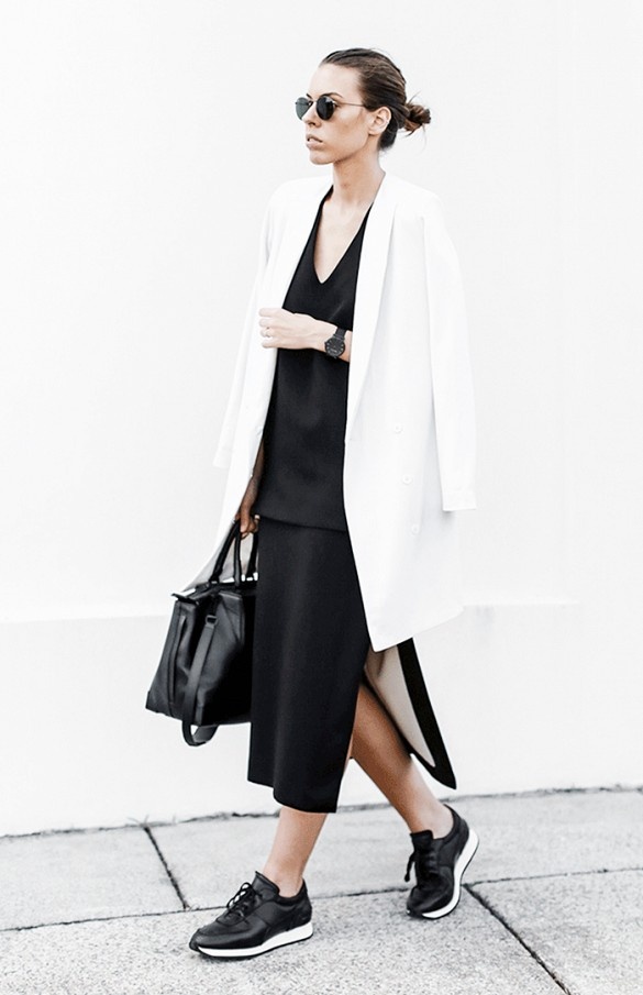 | Xu hướng thời trang trắng đen với váy suông và blazer thích hợp cho vóc dáng cao gầy. |