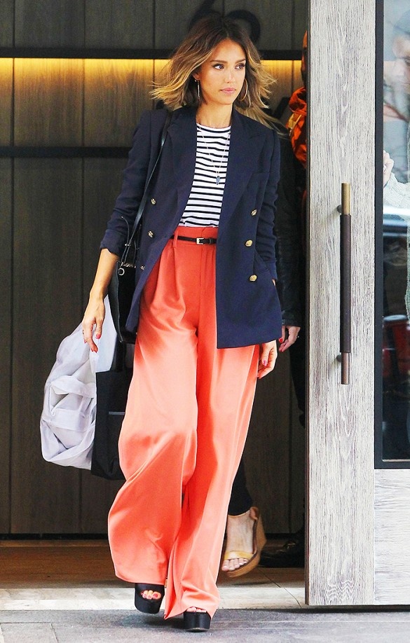 | Jessica Alba lựa chọn blazer và quần ống rộng có tông màu rất nổi bật. |