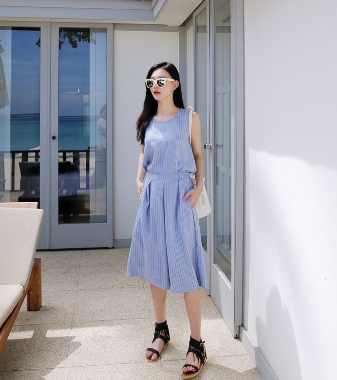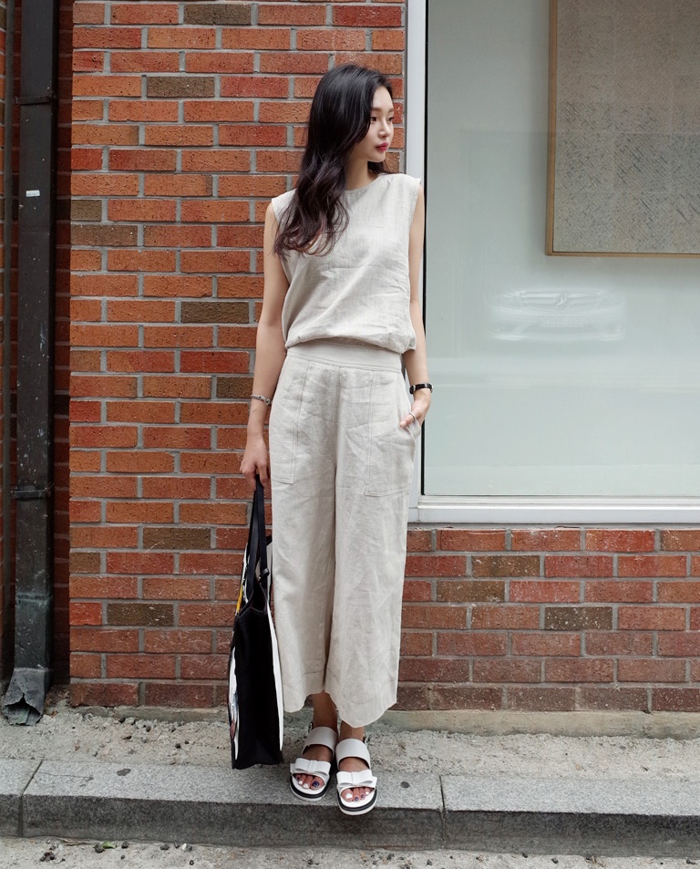 Trang phục culottes với áo khoét chất liệu thô đũi giúp mùa hè thêm mát mẻ.