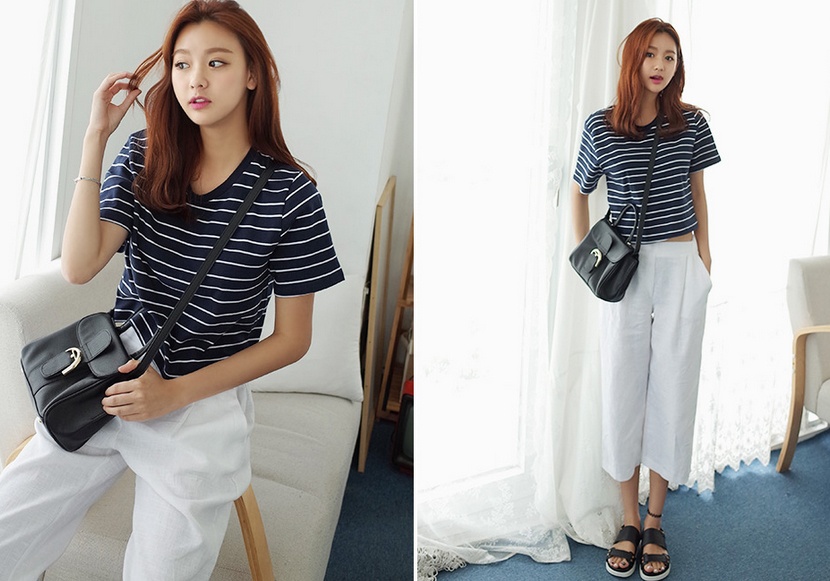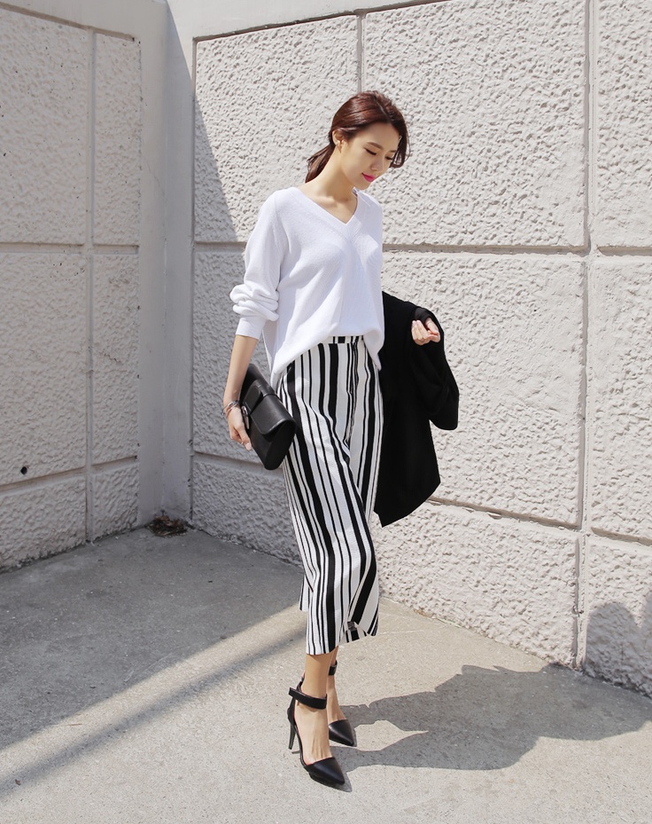 2. Sử dụng họa tiết kẻ: Quần culottes sẽ tạo cảm giác đôi chân dài hơn nếu sử dụng các đường kẻ sọc in trên vải.